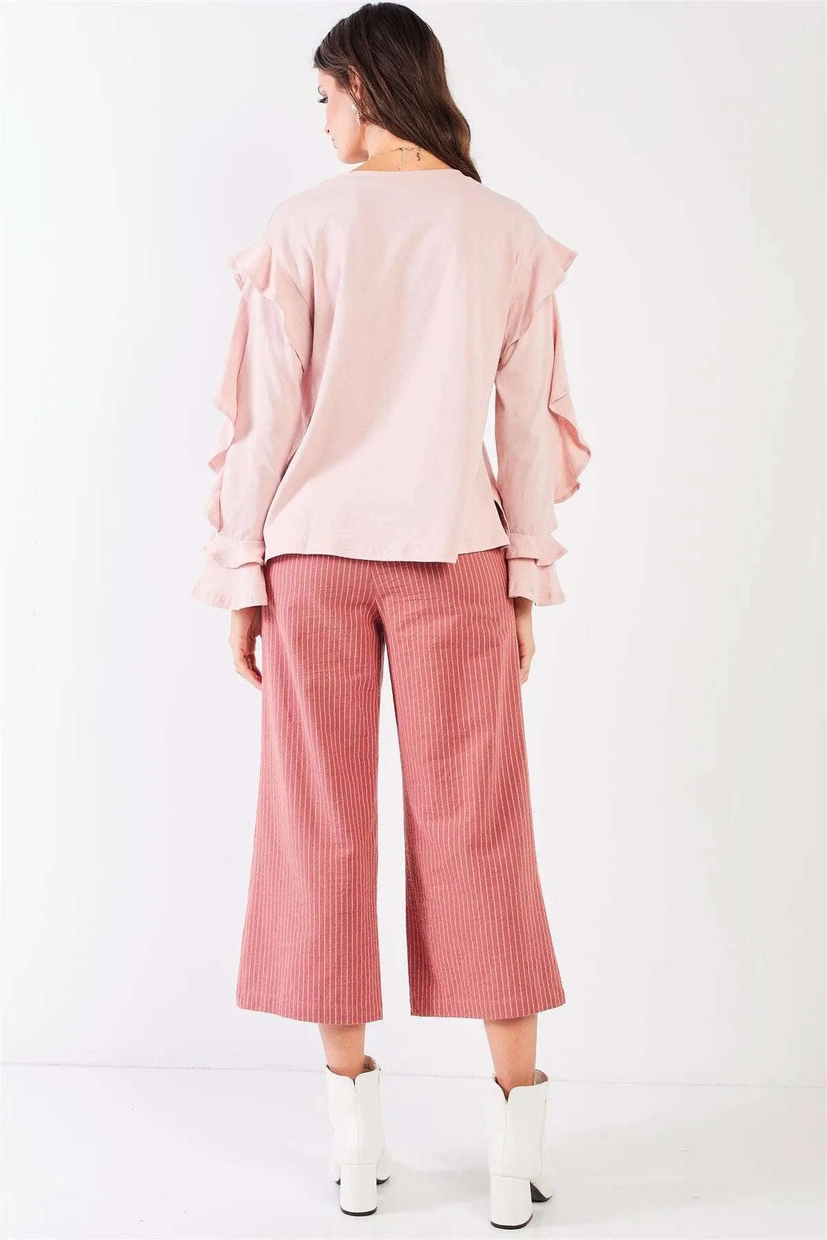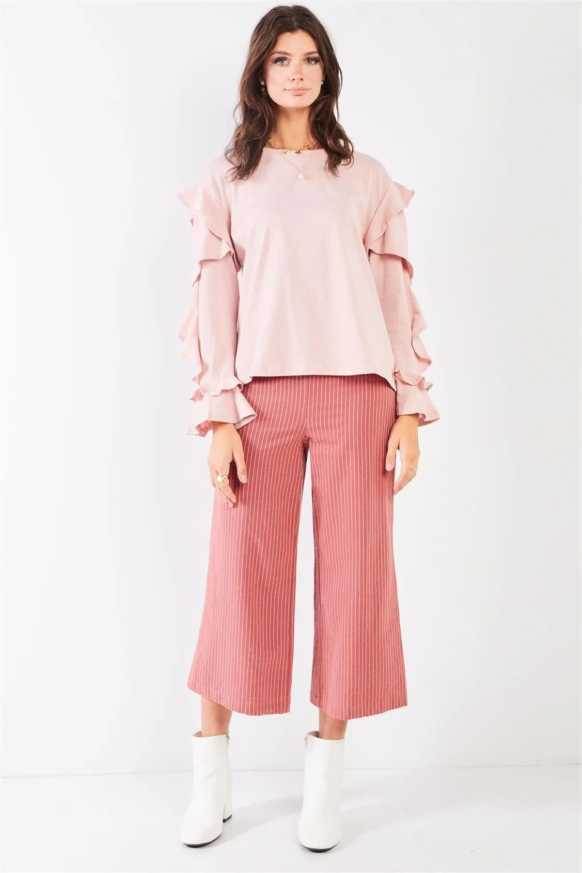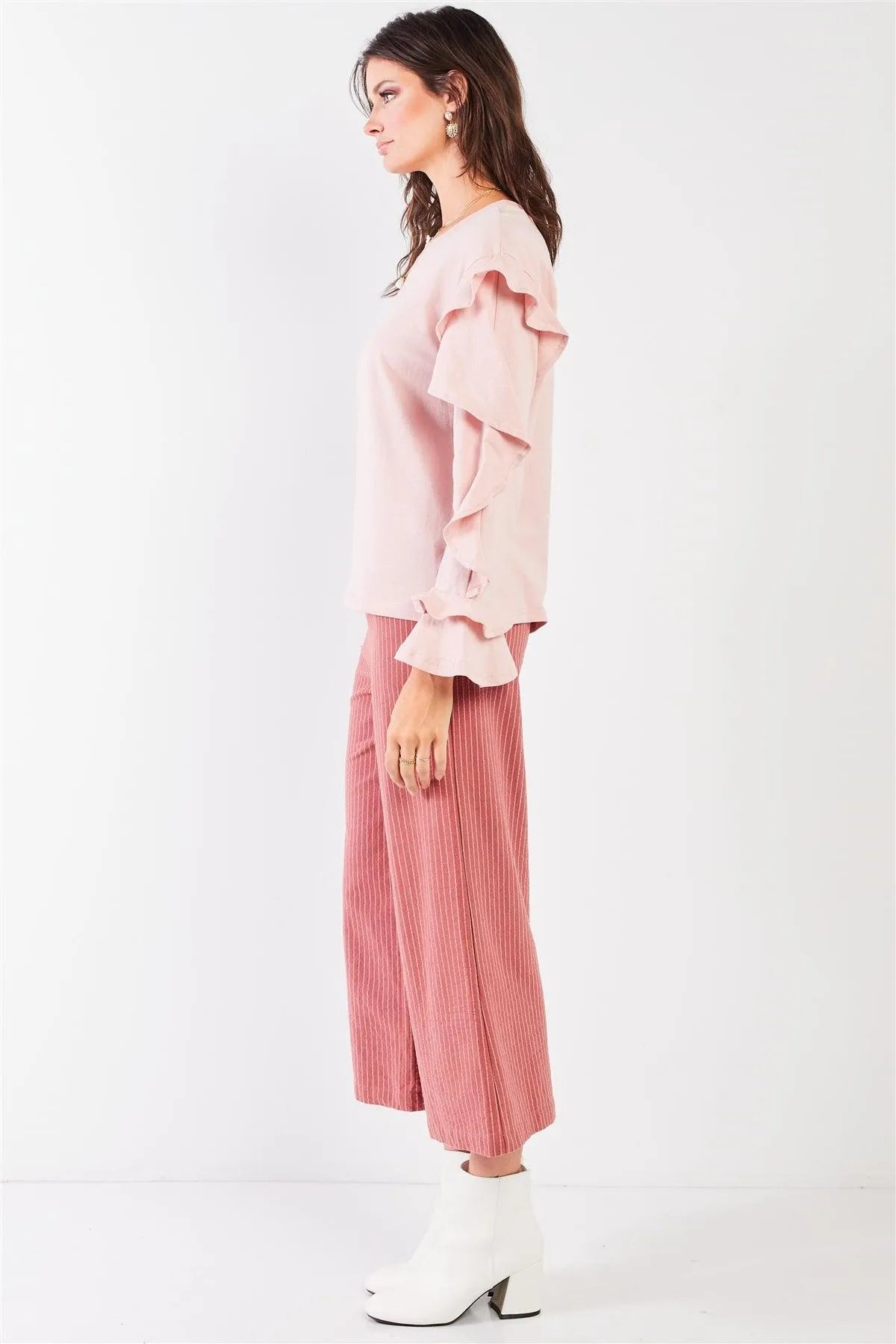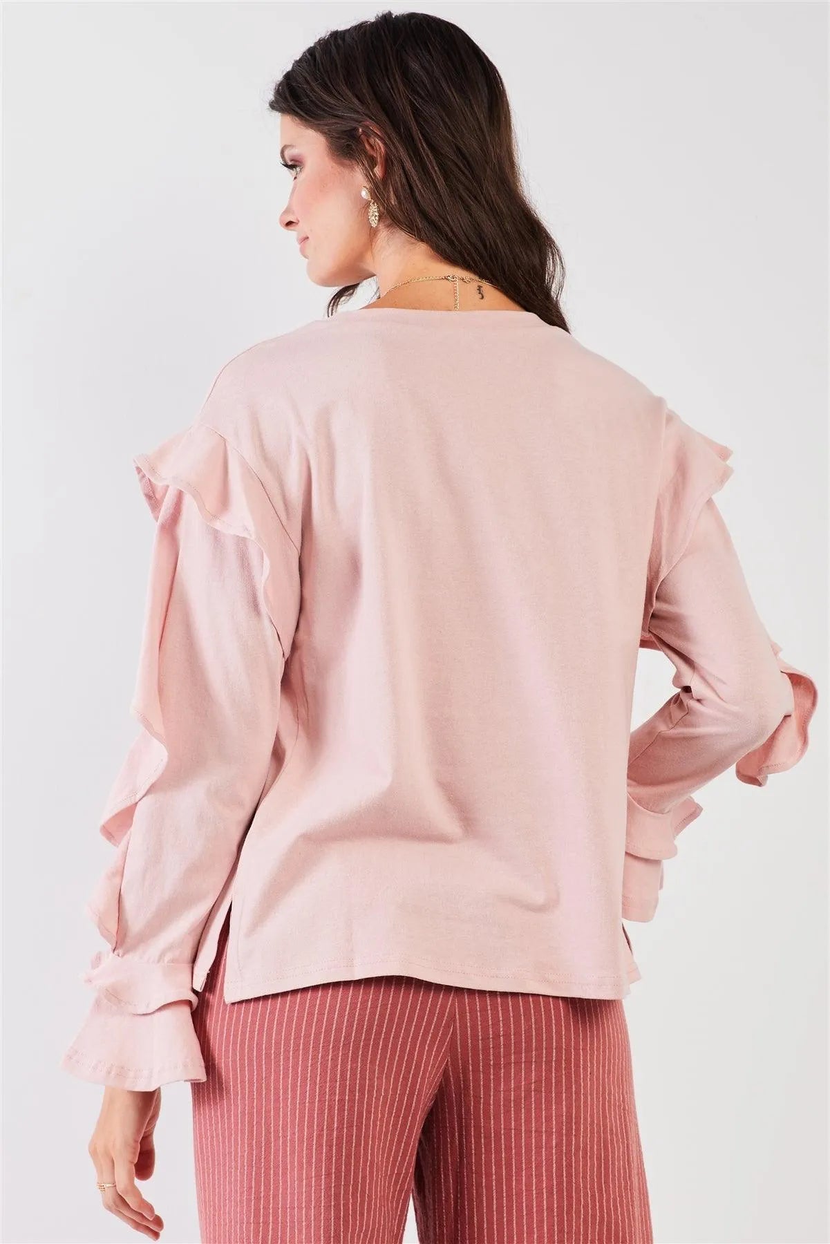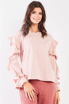 Tender Pink Petal Ruffle Long Sleeve Round Neck Relaxed Top /2-2-2
