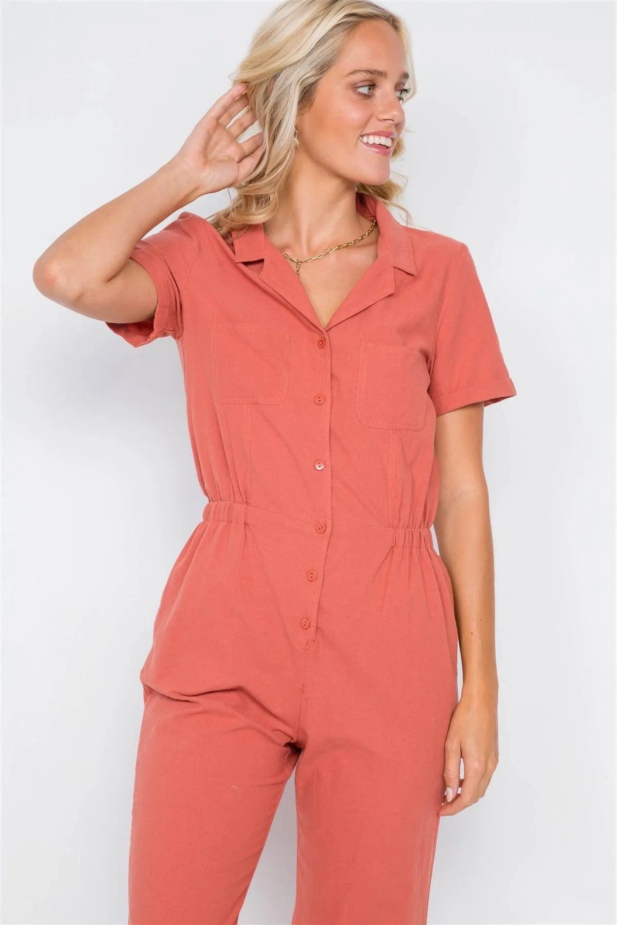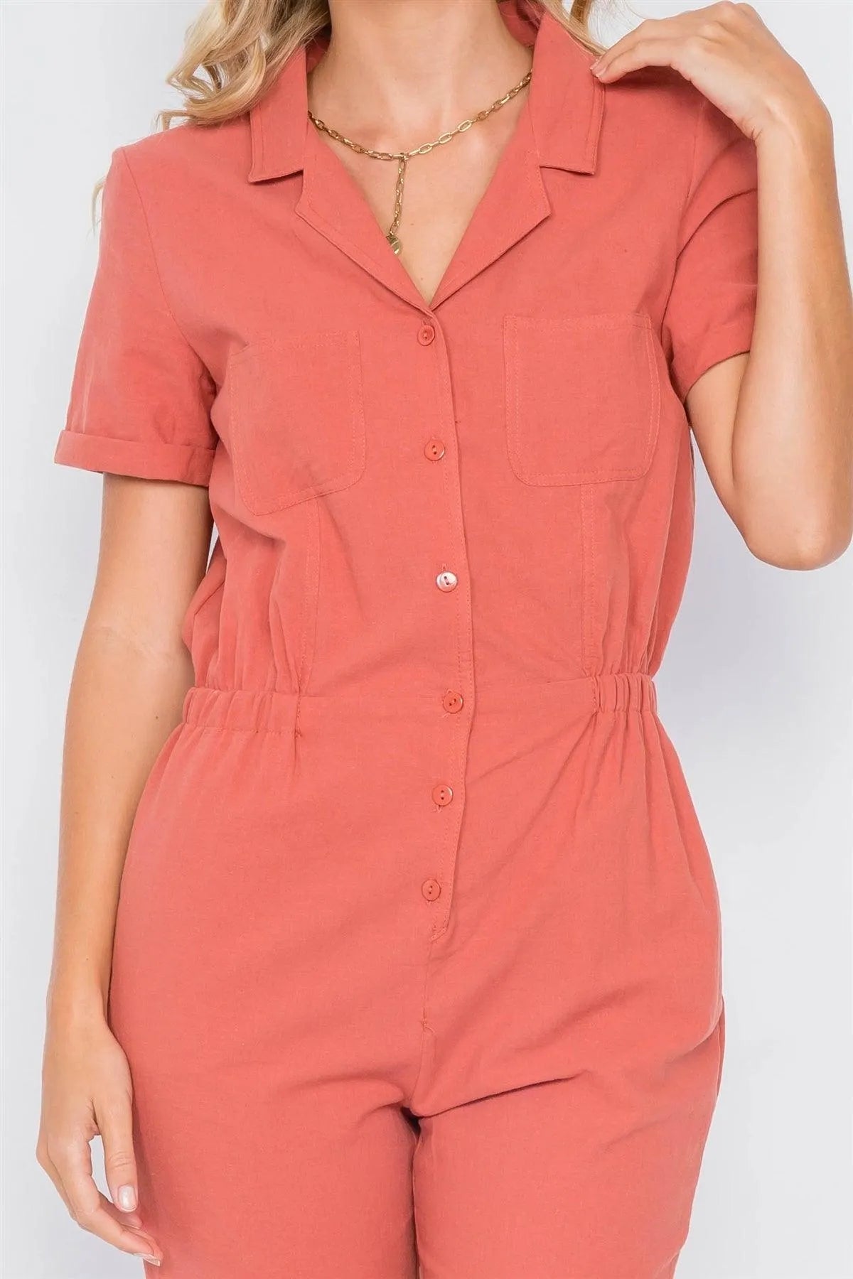 Linen Blend Button-Up Short Sleeve Belted Utility RomperVendor:HYFVE