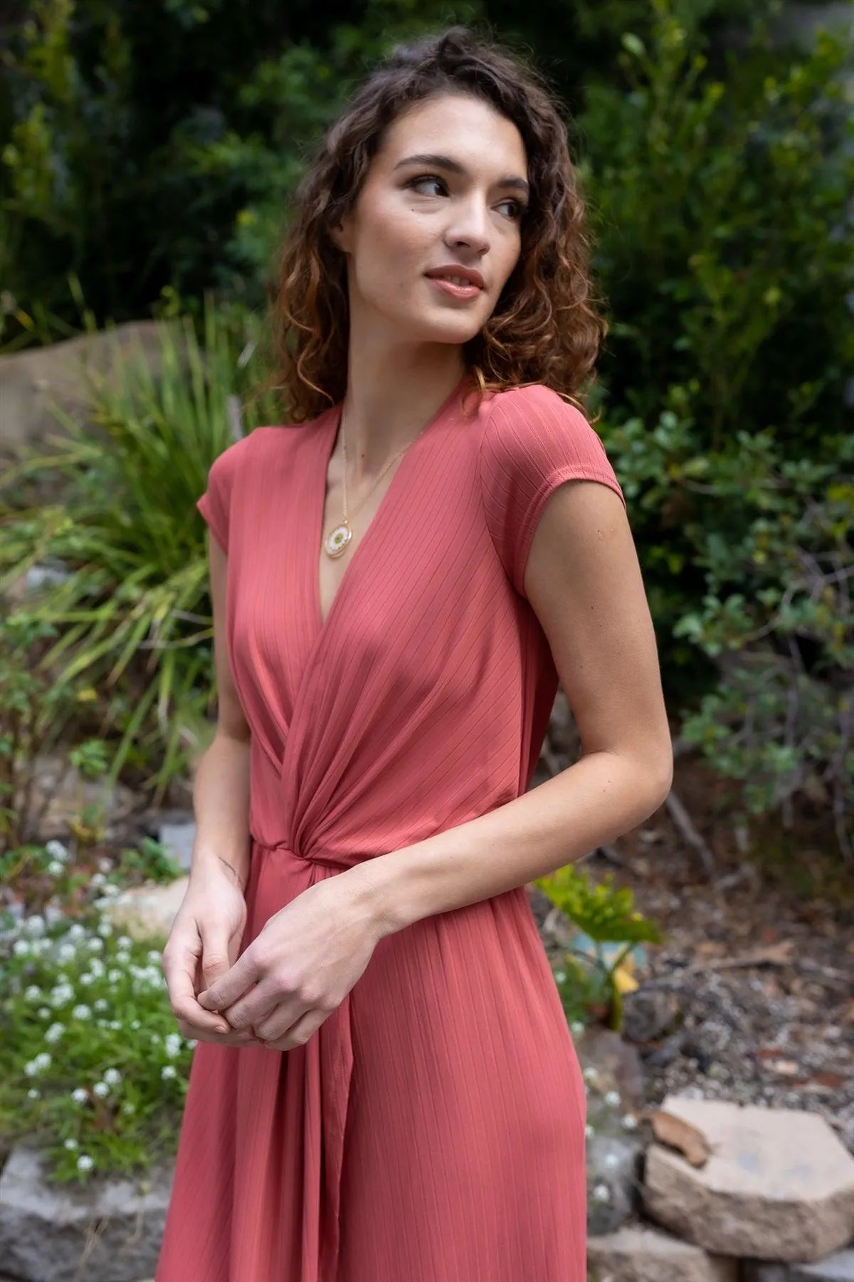 🖤 Item Features: Terracotta, solid color, ribbed texture, front twist wrap detail, v-neckline with snap button, short sleeves, elasticized waistline, midi length, relaxed fit, stretchy, non-sheer, casual, everyday look, trendy, stylish, spring/summer collection