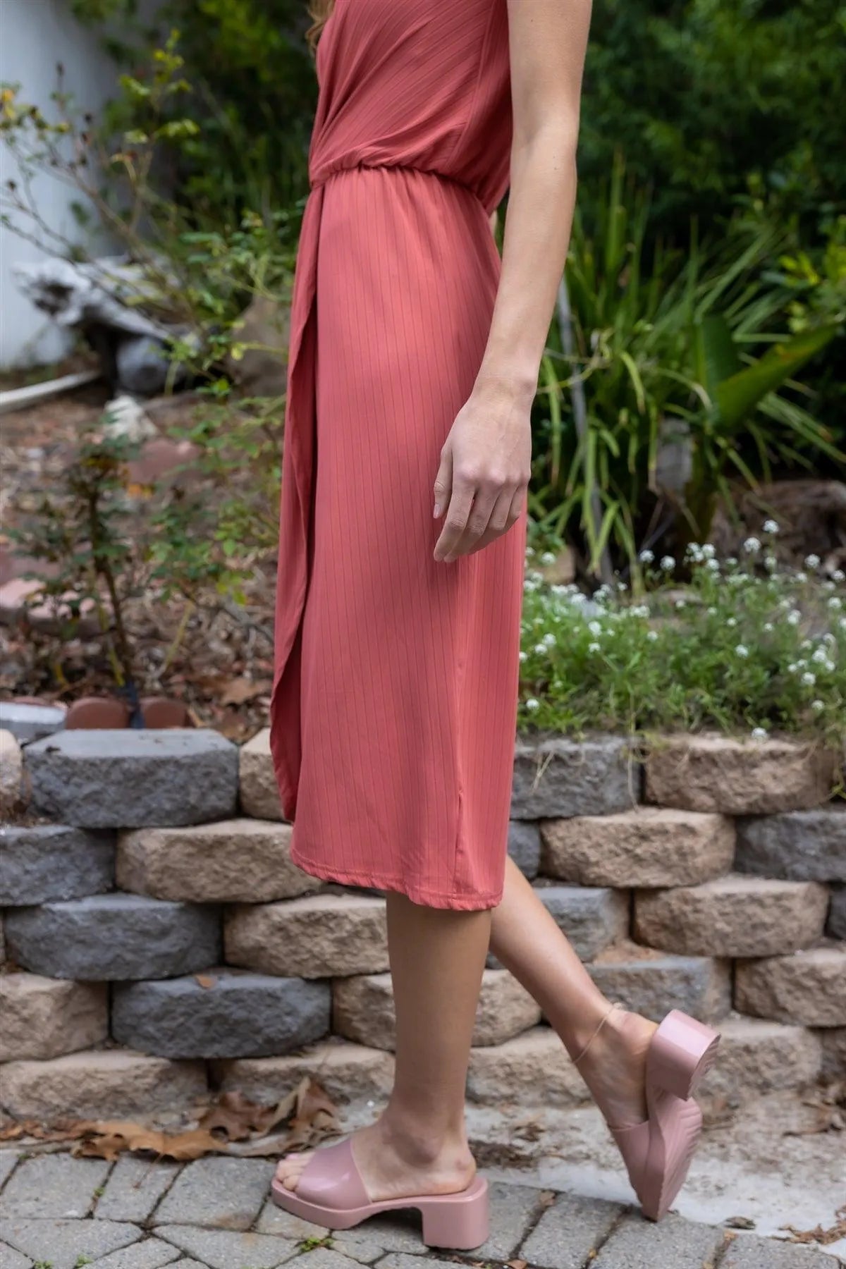 Terracotta Ribbed Front Twist Wrap Detail V-Neck Midi Dress /1-3-1-1
