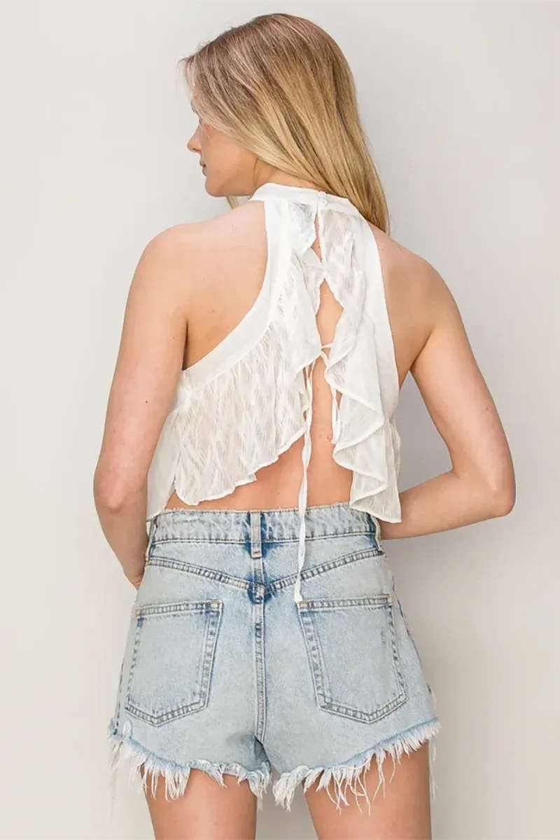 Textured Chiffon Ruffle High-Neck Open-Back Halter Crop Top