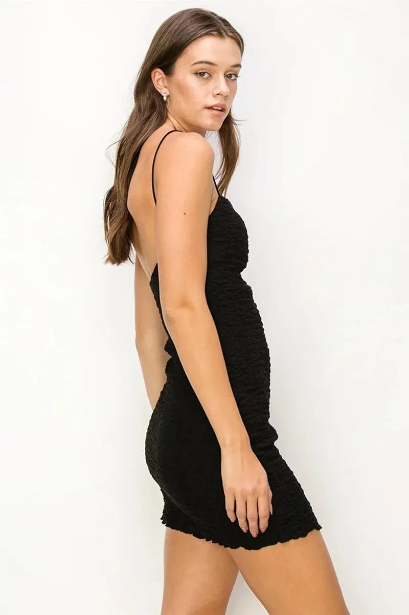 🖤 Features: Textured woven fabric, thin adjustable straps, straight neckline, low open back, body-skimming fit, mini length, scalloped hemline, slight stretch construction, pull-on design