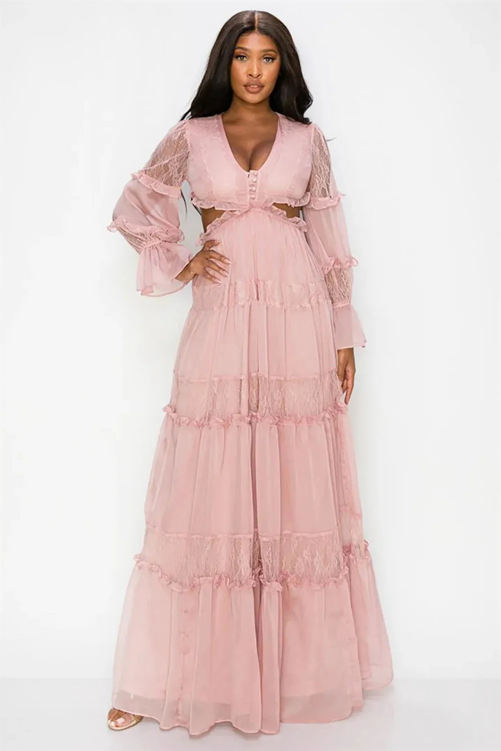 🖤 Features: Lightweight semi-sheer fabric, delicate lace panel details, feminine ruffle tiers, dramatic bell sleeves, flirty side cutouts, V-neckline with button front, floor-length design, true-to-size fit