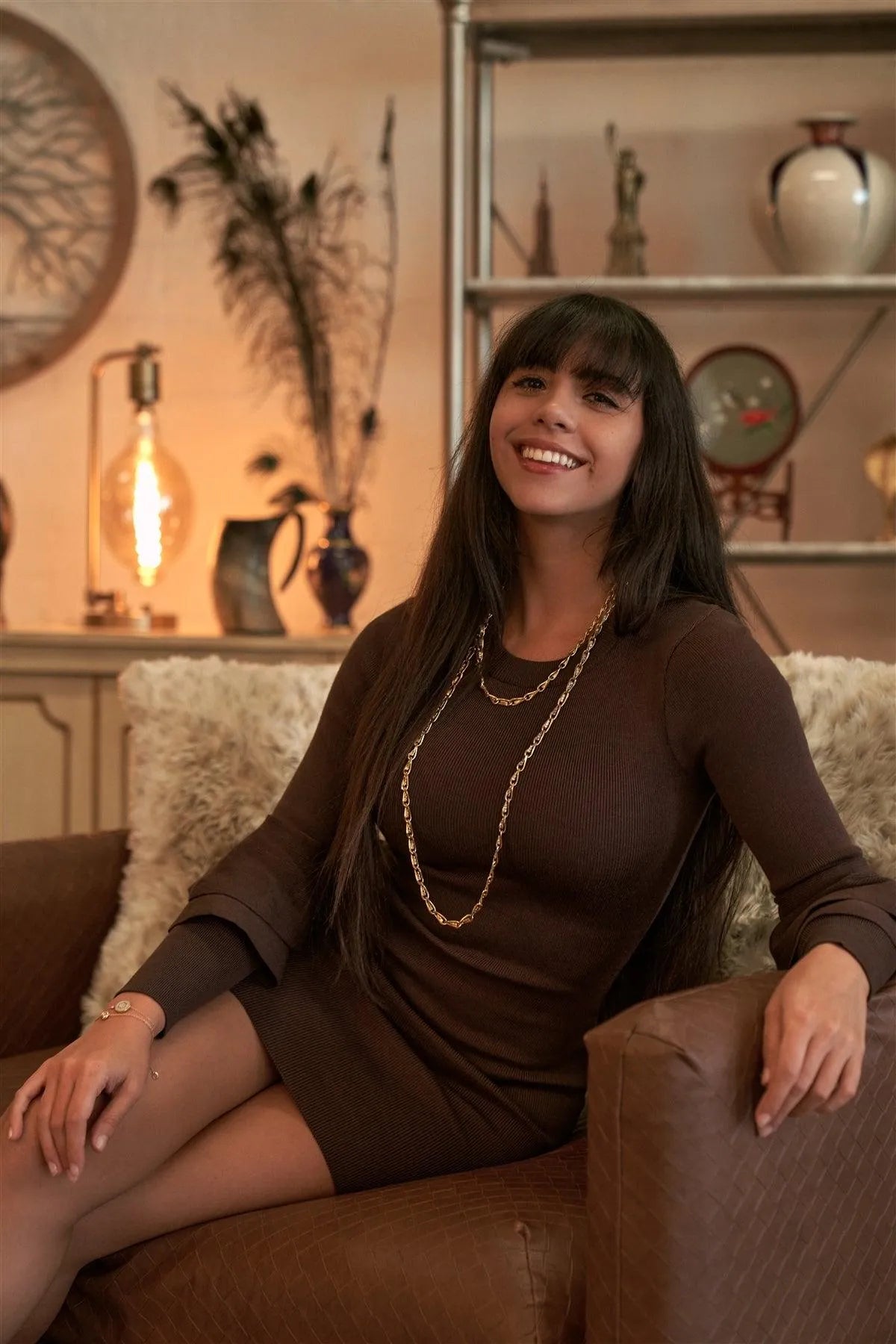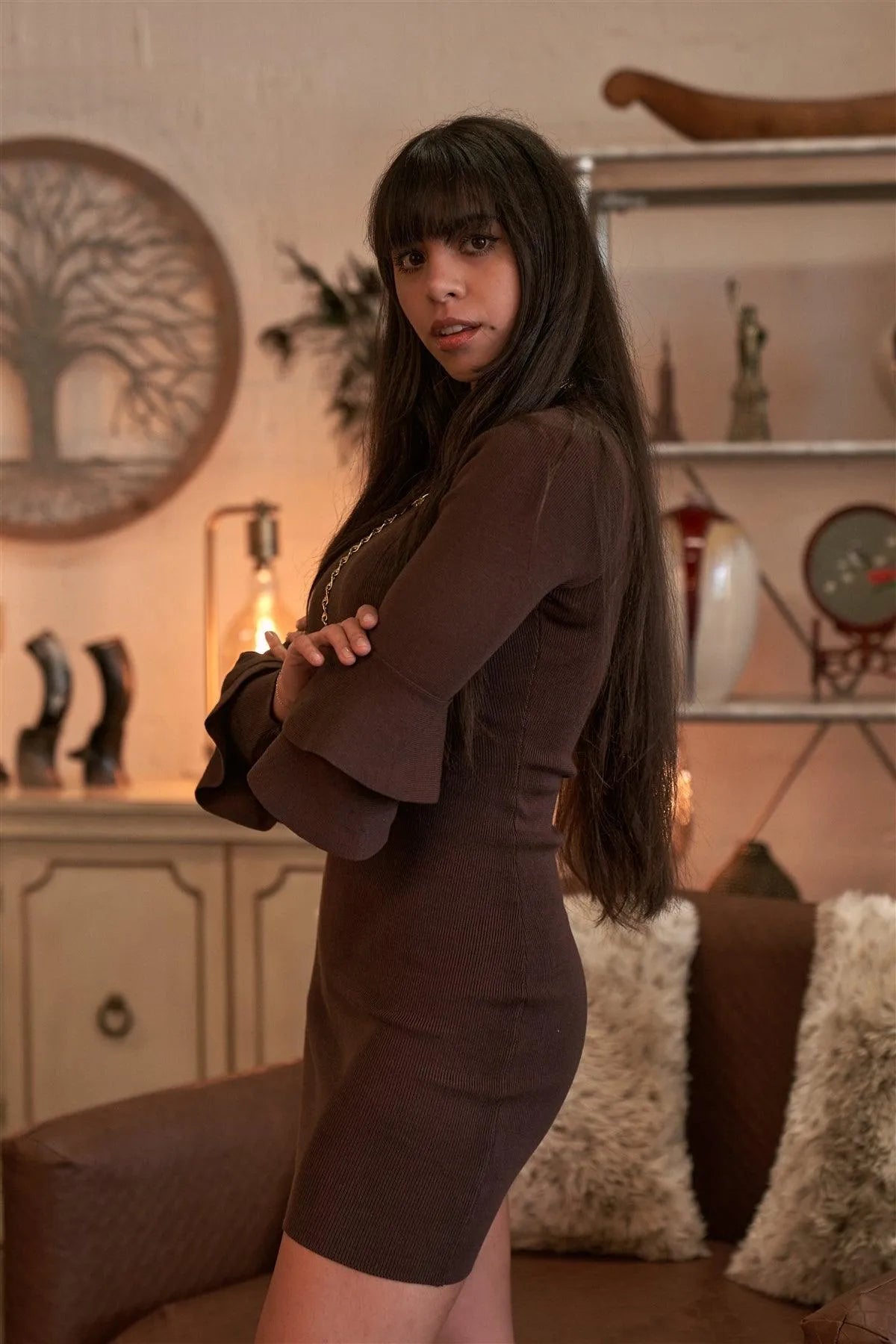 🖤 Item Features: Solid, dark coffee brown, tight fitting, unlined, round neckline, sweater type, long double frill detail sleeve, mini length, unlined, fall/winter wear, casual, warm, comfortable, breathable.