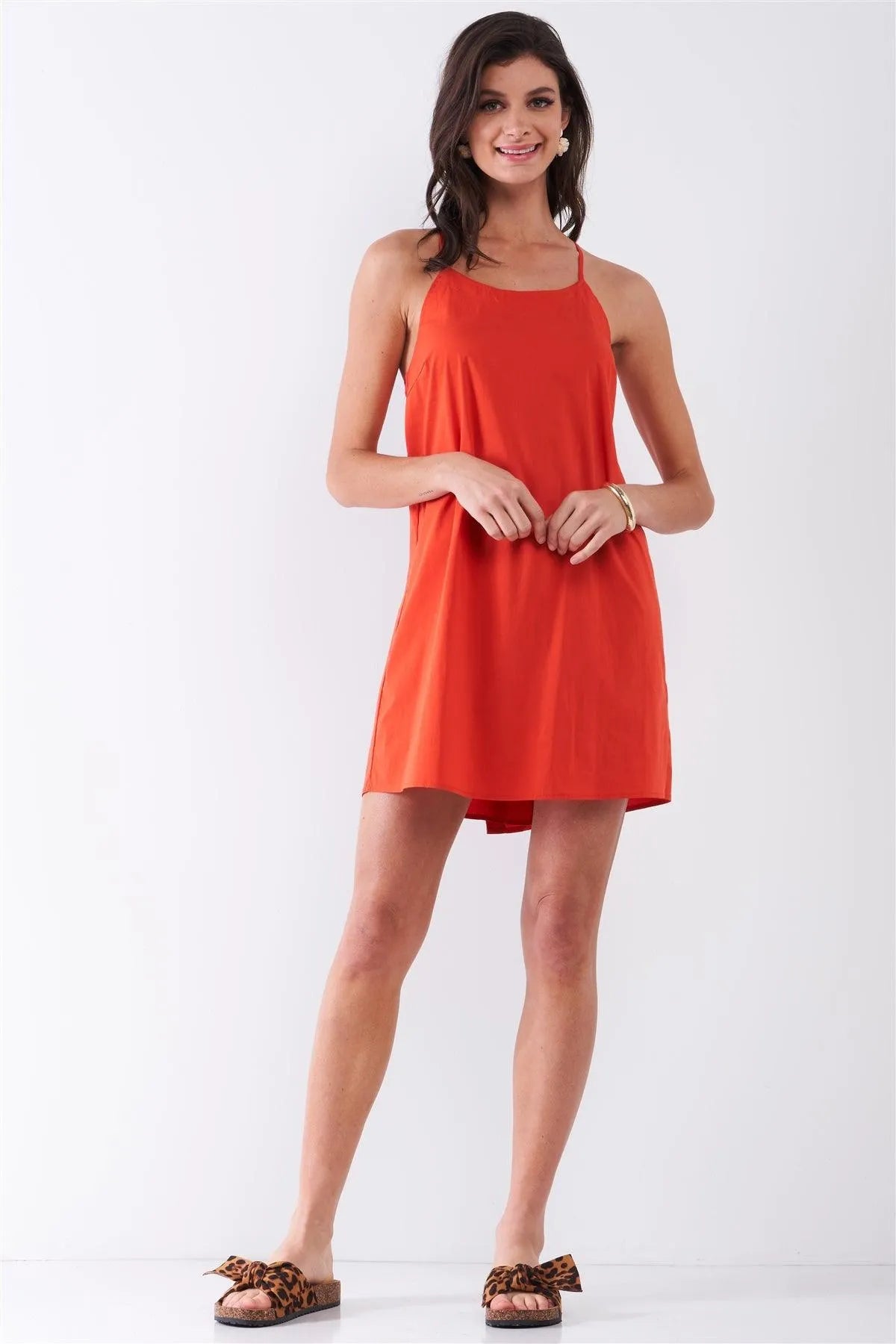 🖤 Item Features: Tomato red, solid, sleeveless, adjustable shoulder straps, criss-cross back, u-neckline, back button down detail, loose fit, unlined, non-sheer, stretchy, mini length, cotton, breathable, cute, girly, spring/summer collection