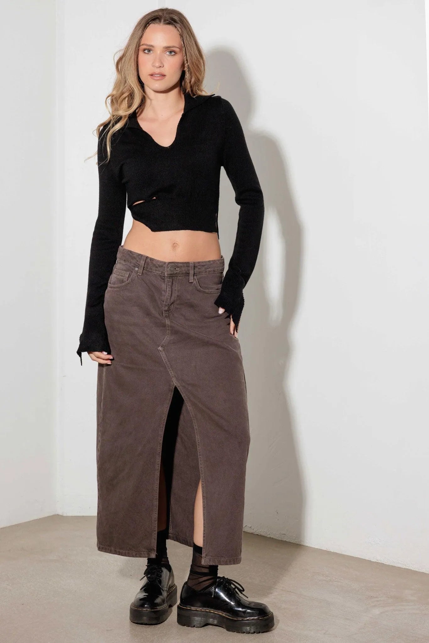 Upgrade your wardrobe with our Cut Out Collared Crop Sweater Top. This top features a unique cut-out design and a stylish collared neckline. Stay chic and trendy with this crop top that pairs perfectly with high-waisted jeans or skirts. Perfect for any occasion, this top is a must-have for any fashion-forward individual.