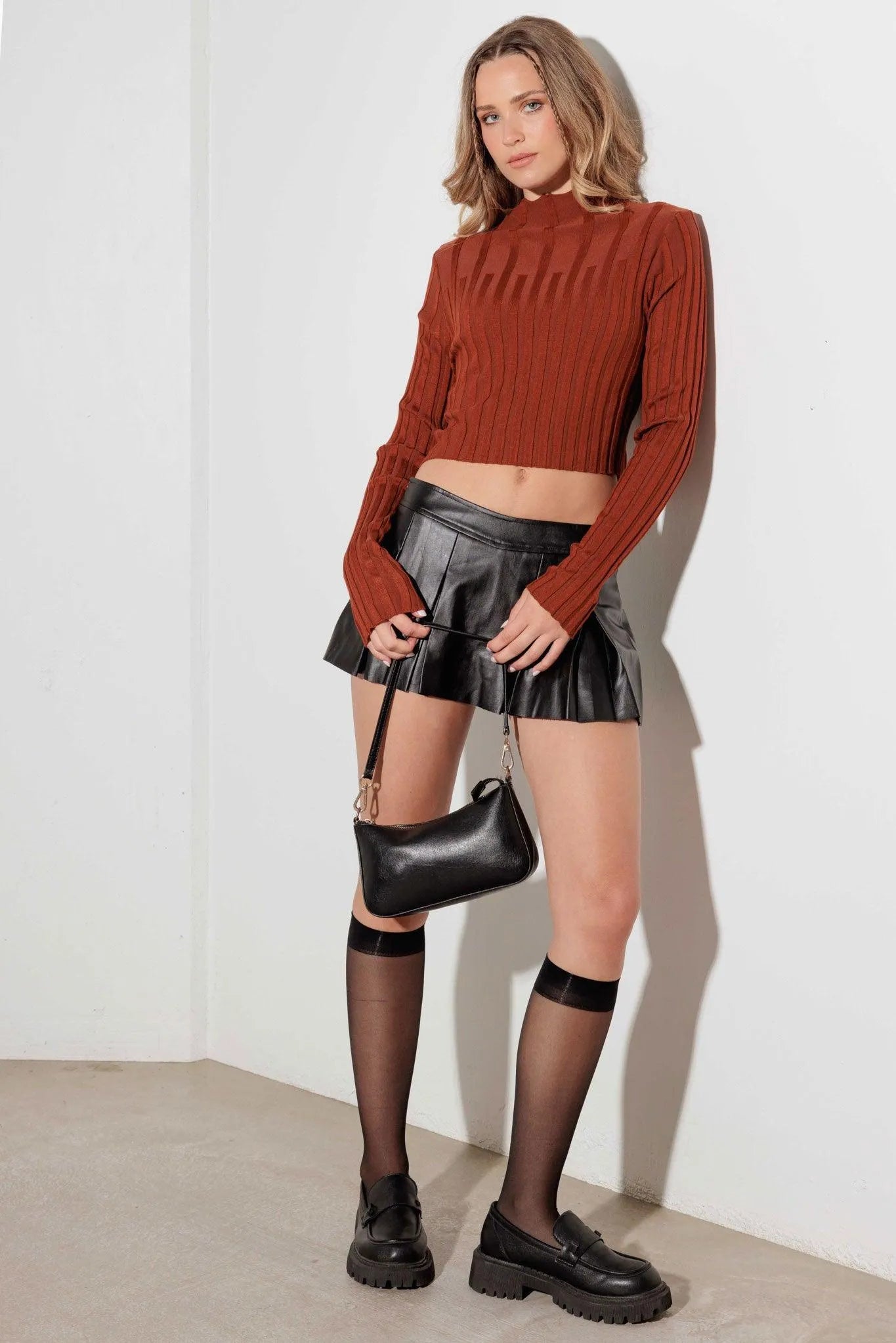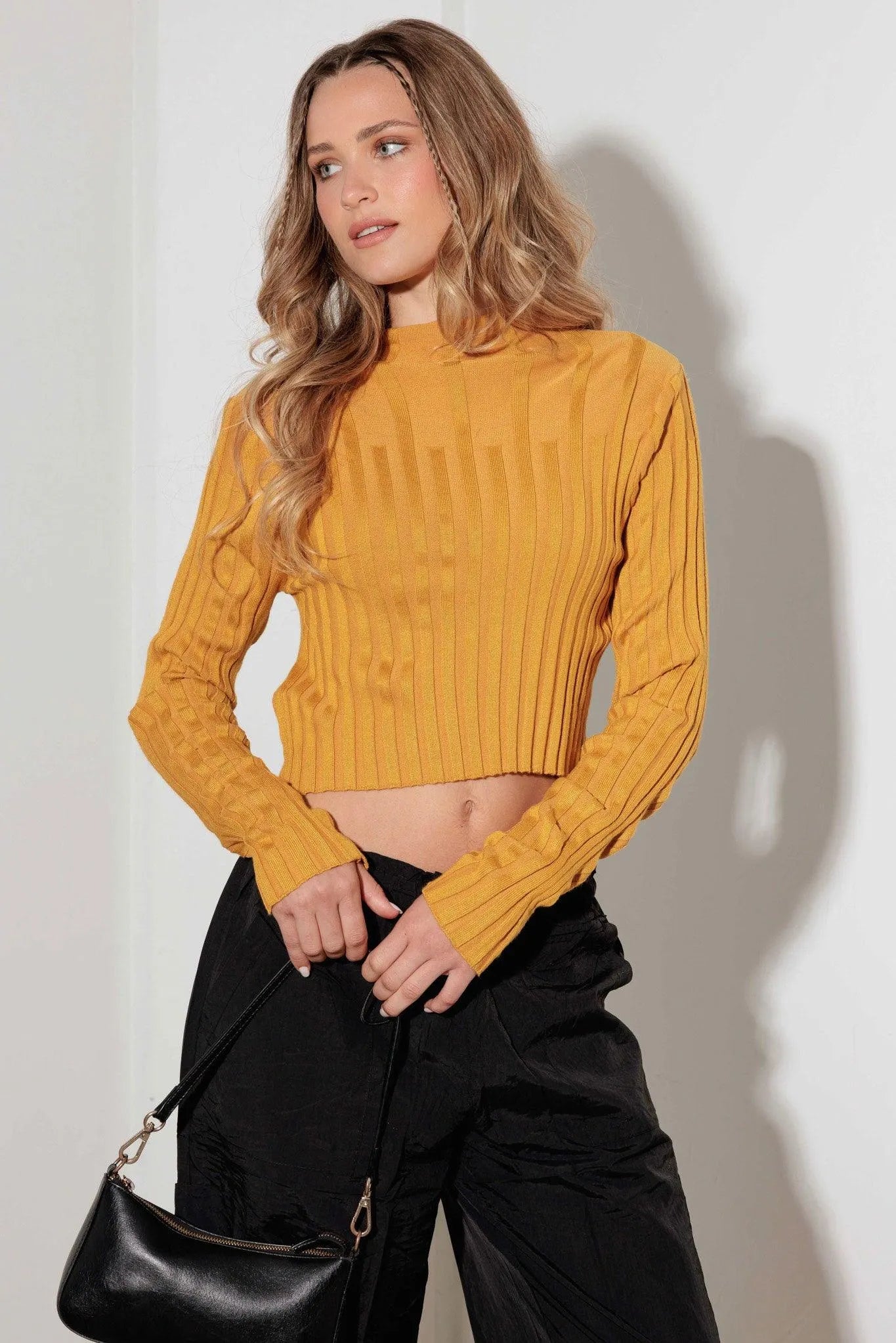 This long sleeve crop sweater features a unique cut out design and ribbed texture, creating a stylish and flattering look. With its soft material, it provides both comfort and fashion, making it a must-have for any wardrobe. Stay on-trend with this versatile and chic sweater.