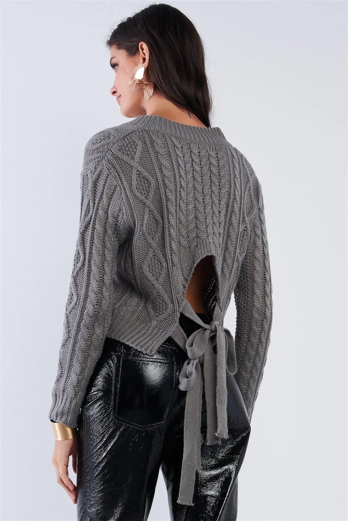 Grey Long Sleeve V-Neck Knit Self-Tie Open Back Cropped Sweater