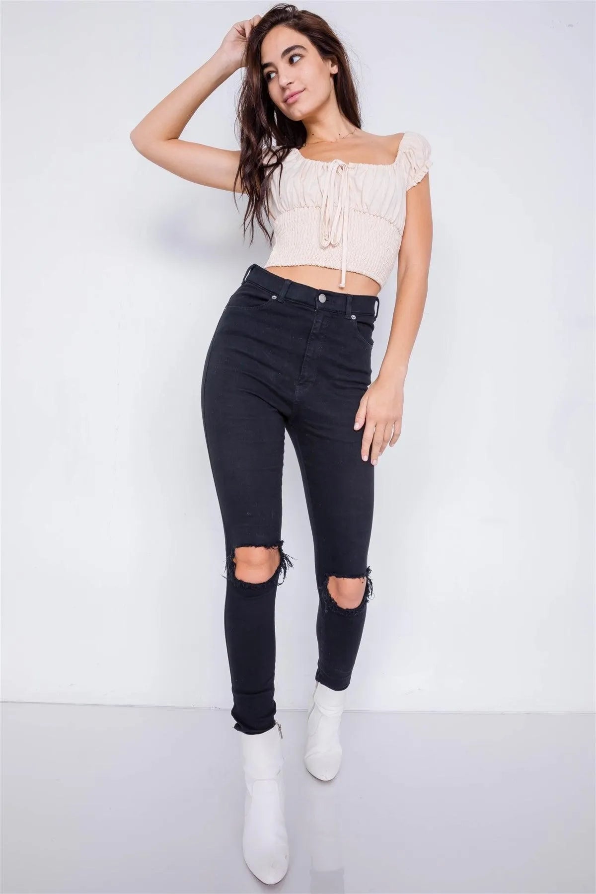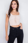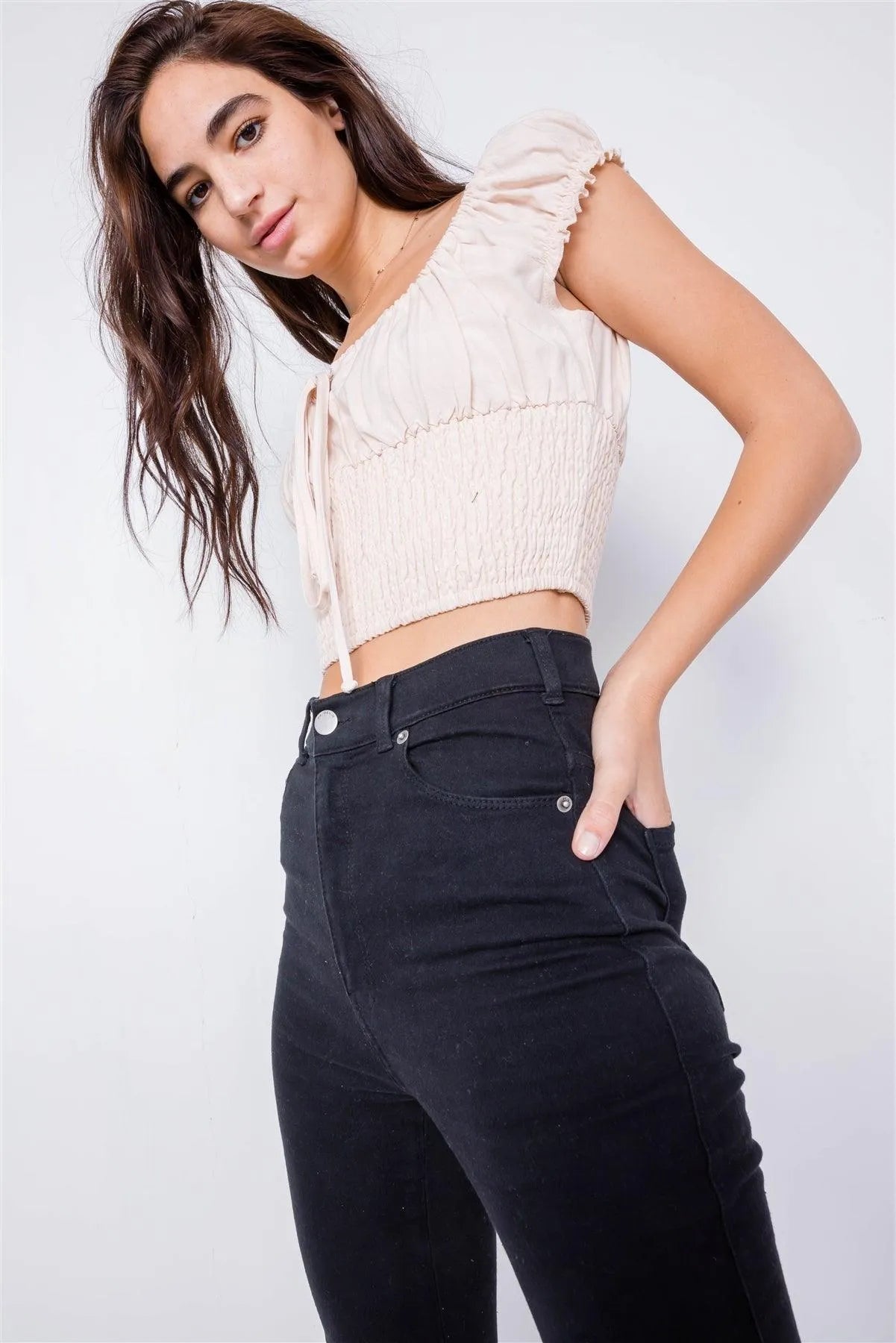 Top features: off-the-shoulder, elastic ruche, adjustable middle bow tie, elastic frill cap sleeve, round neckline, crop length, boho chic, vintage, classic, solid, washed, unlined, super stretchy. Item Measurements: Length: 16.5" Bust 32"Model is 5'9" and wearing a Small (Waist: 24", Bust: 33B", Hips: 36")True to size Also available in Dusty Rose