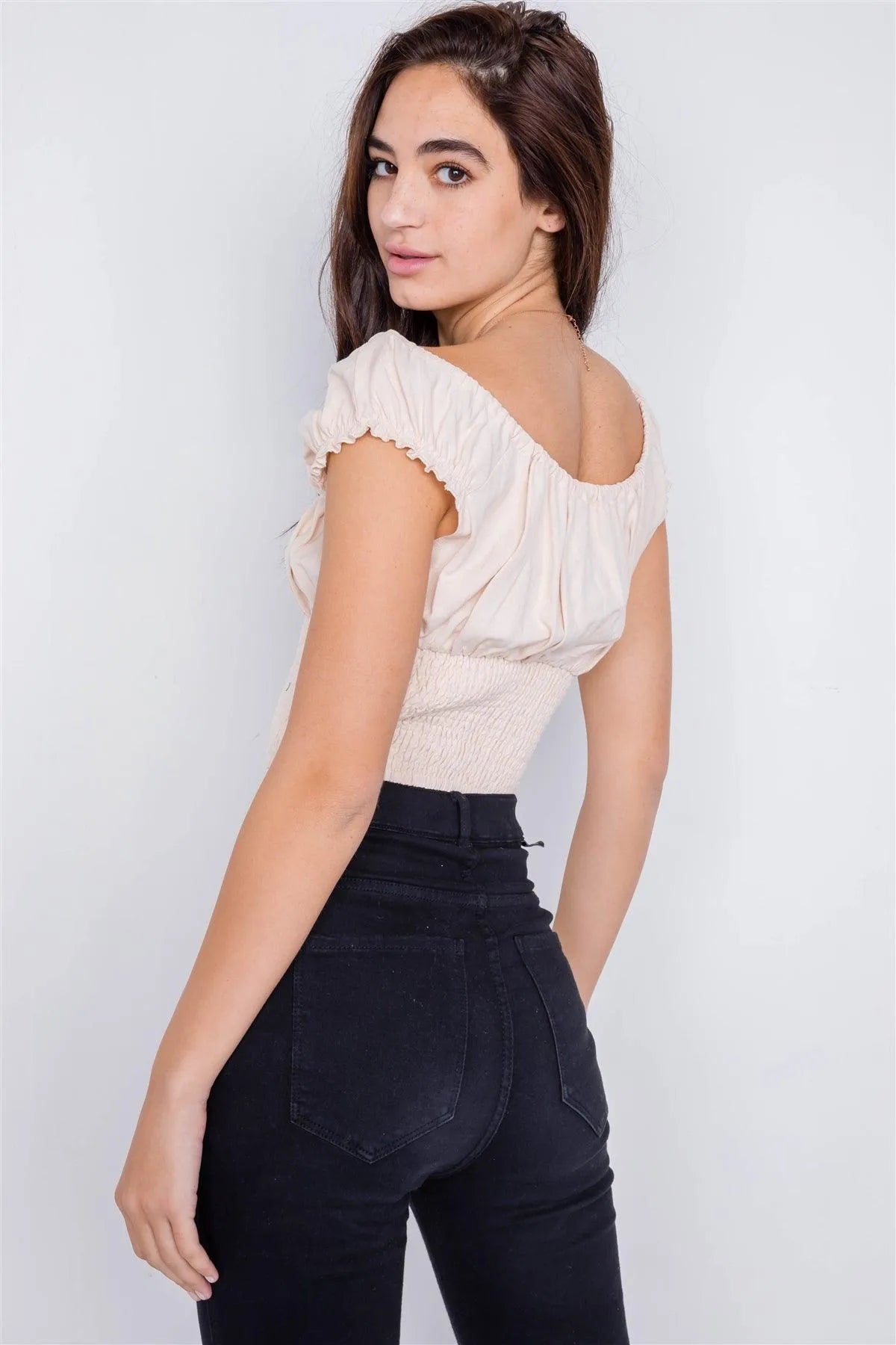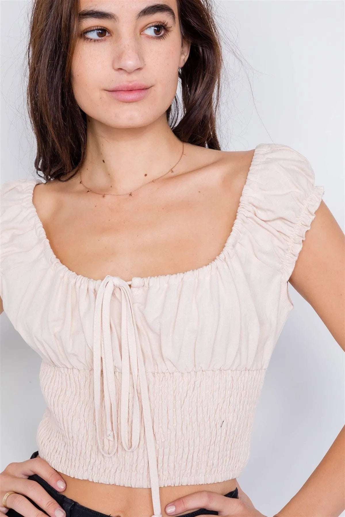 Vanilla Mixed Linen Smocked Off-The-Shoulder Crop Top /1-1-1