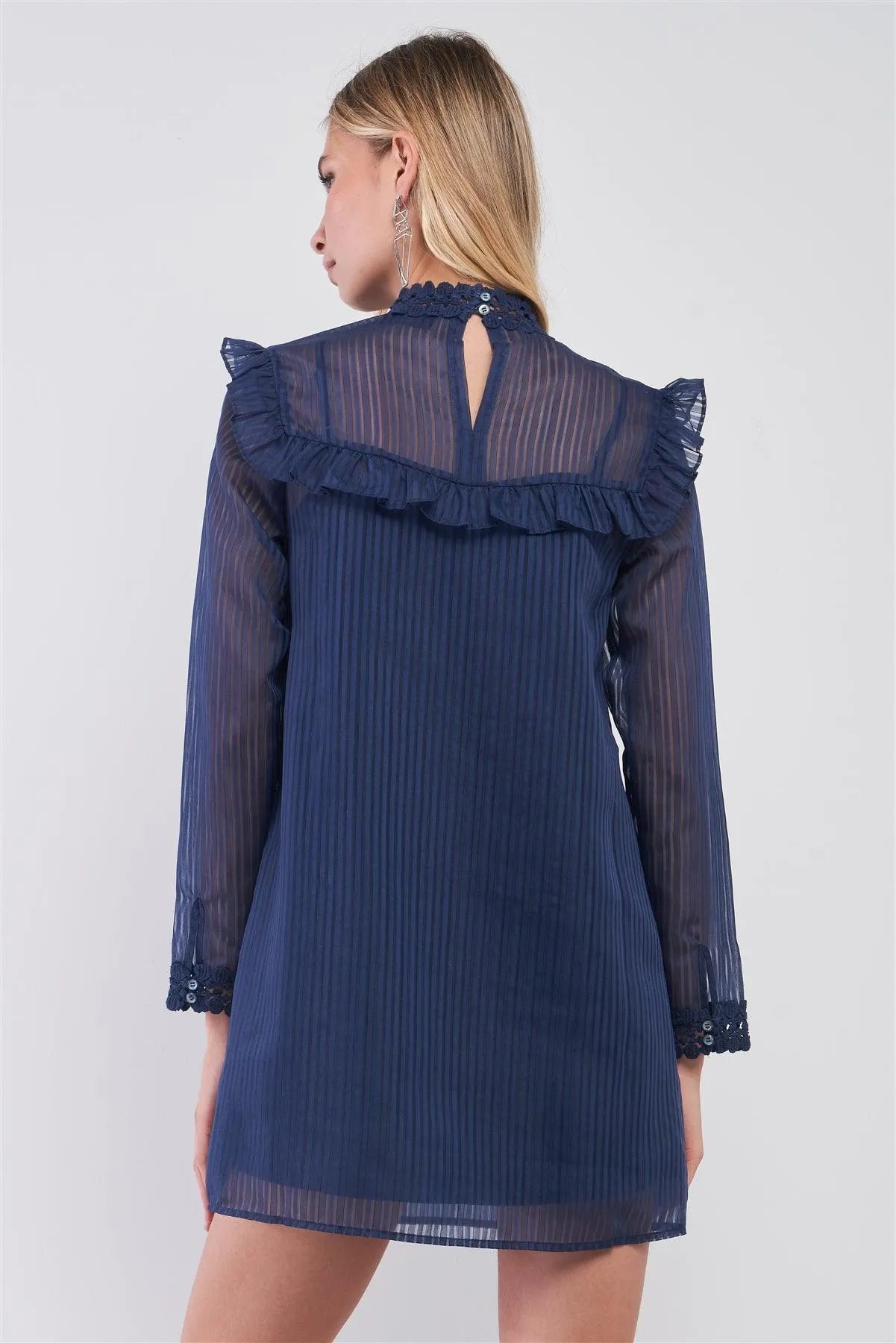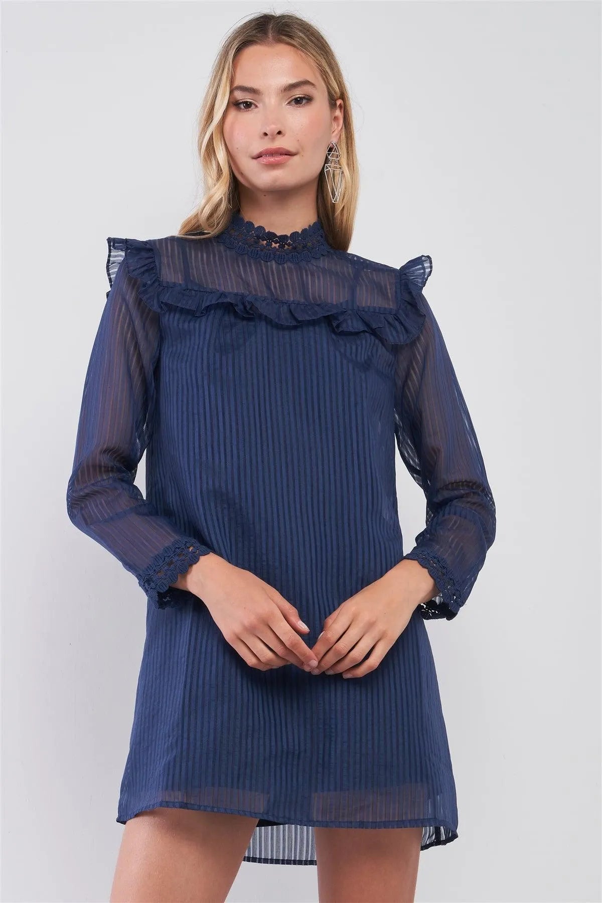 Victorian Blue Sheer Striped Ruffle Trim Mock Neck Long Sleeve Crochet Detail Straight Mini Dress /1-2-2-1