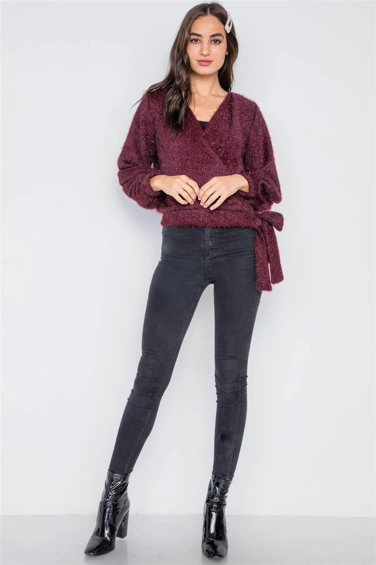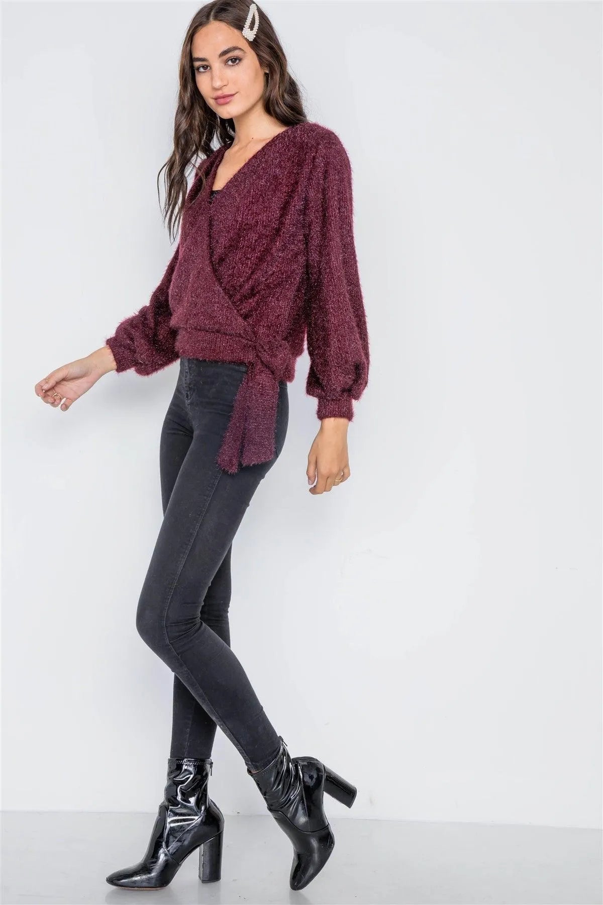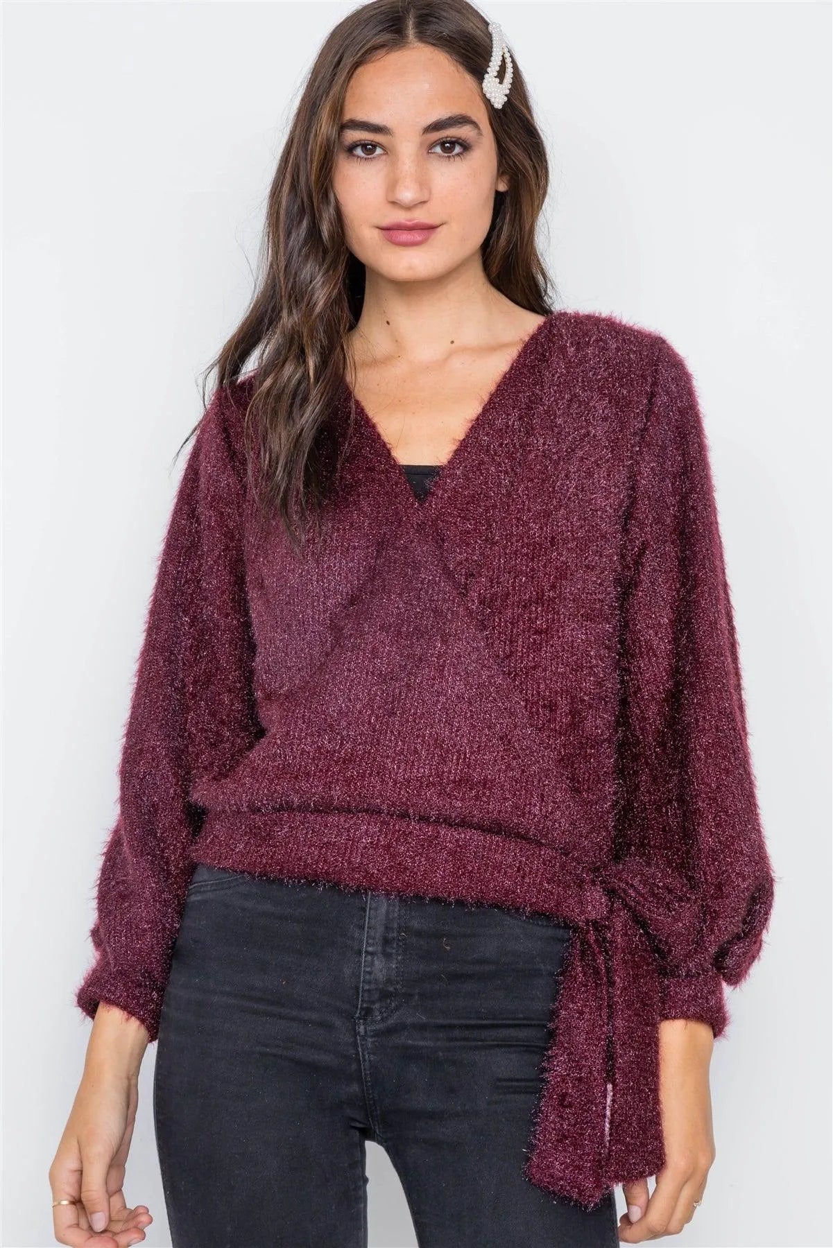 Violet Fuzzy Long Sleeve Surplice Sweater /1-2-2