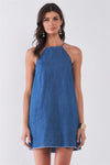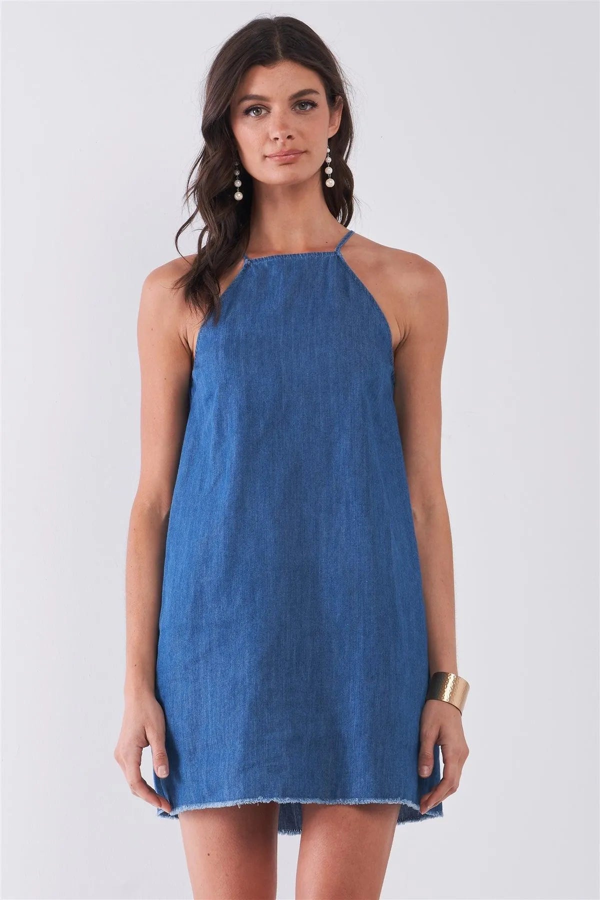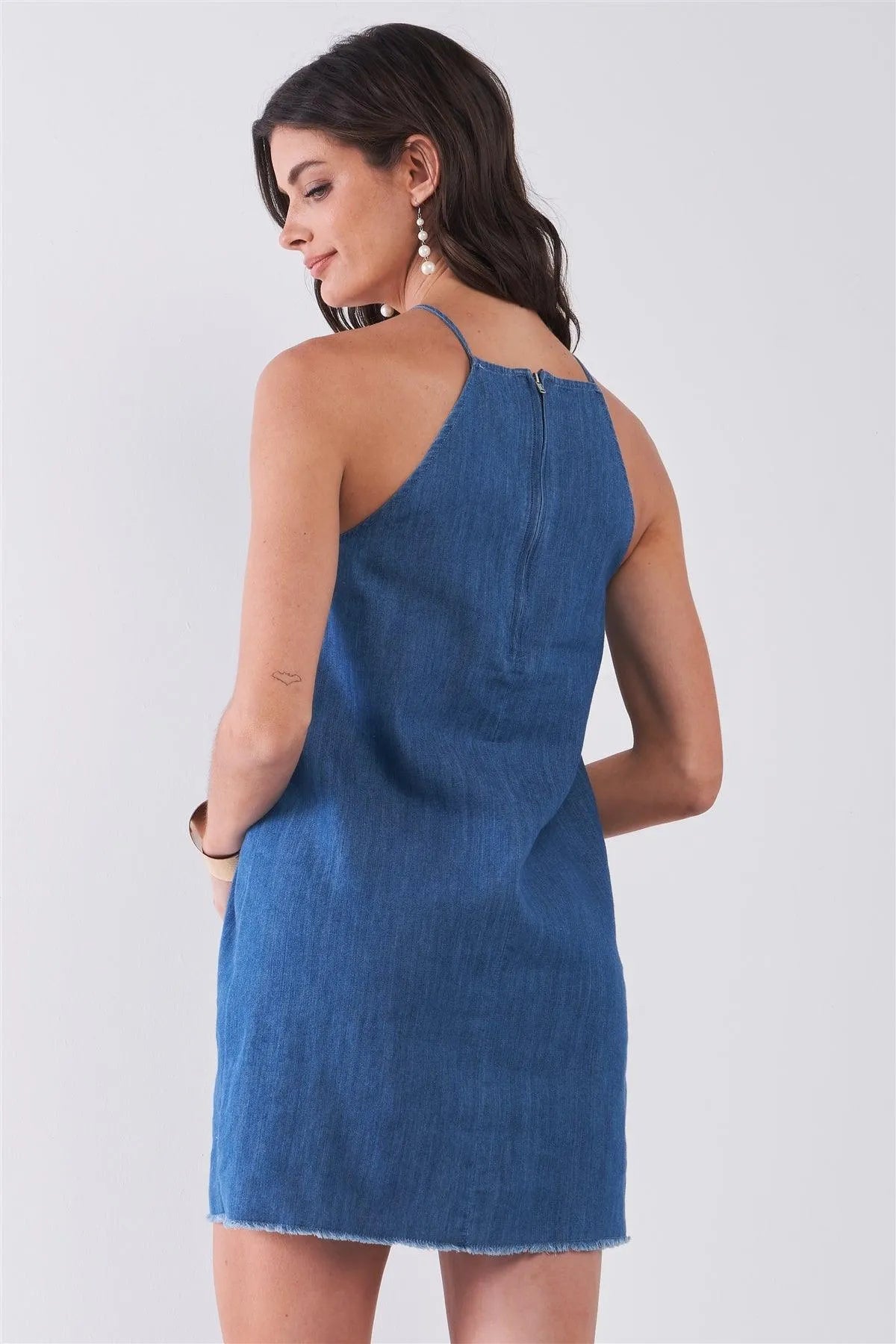 Washed Blue Sleeveless High-Neck Spaghetti Strap Raw Hem Mini Denim Dress /1-2-2