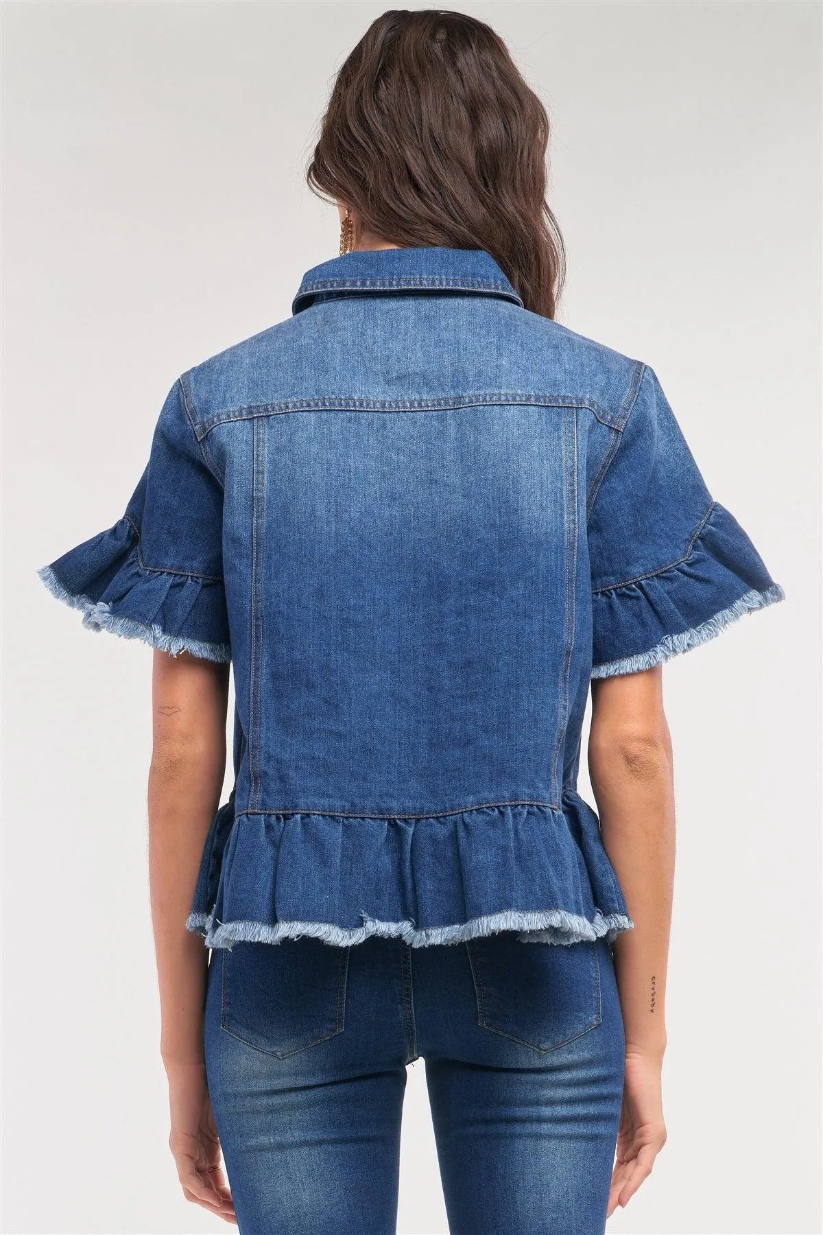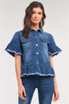 Medium Blue Washed Denim Effect Short Sleeve Button-Down Front Flare Shredded Hem Shirt Jacket /2-2-2