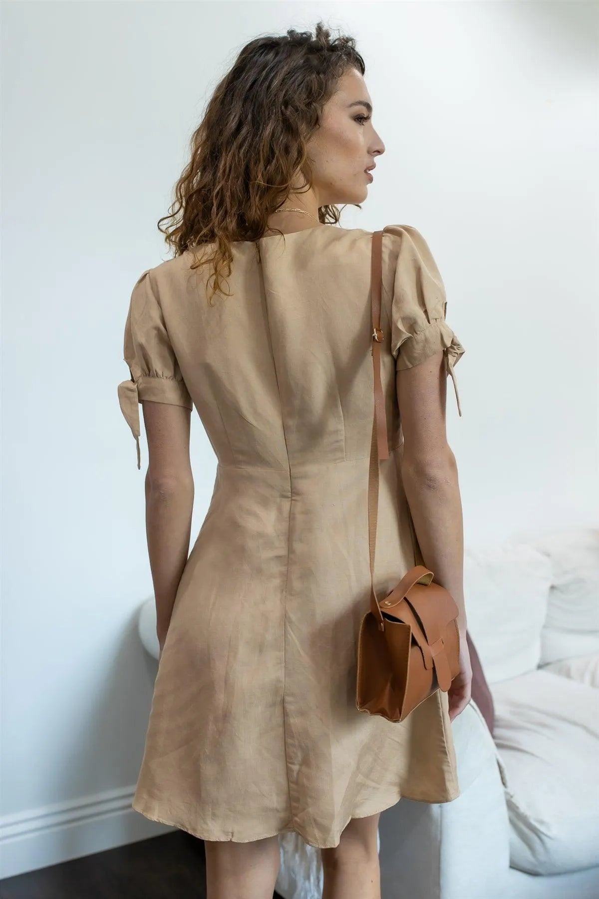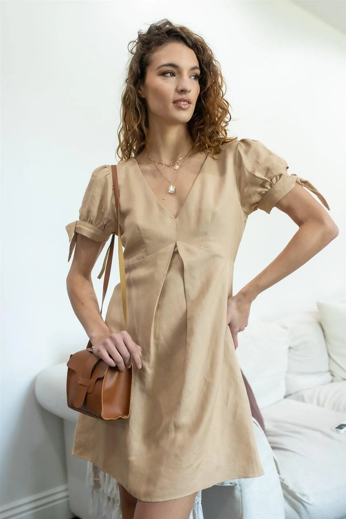 🖤 Item Features: Wheat, solid color, linen blend material, self-tie sleeve details, puff cuffed short sleeves, front fold detail, v-neckline, back hidden zip and hook & eye closure, mini length, lined, non-stretchy, non-sheer, casual, breathable, cute, girlish, summer vibe, stylish