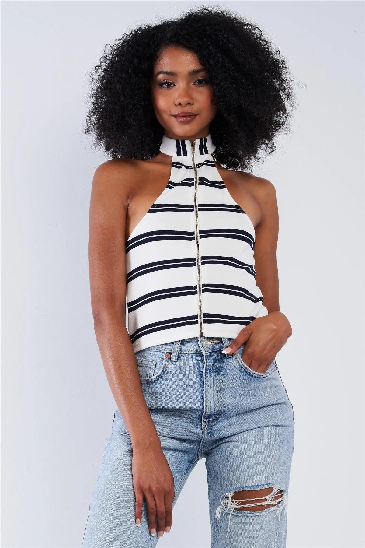 Striped Sleeveless Loop Neckline Zipper Cropped Top