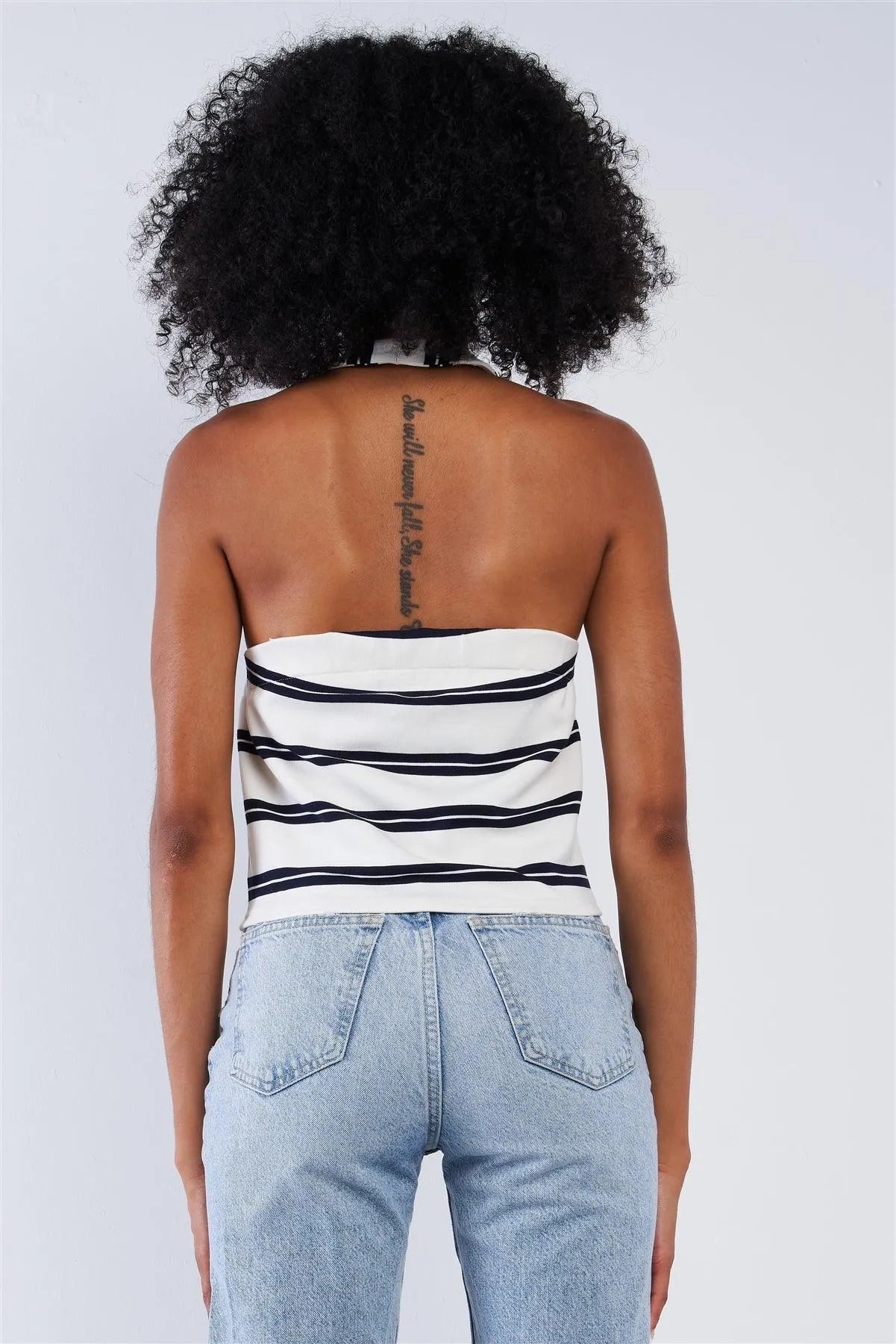 🖤 Item Features: White top, navy blue horizontal double strip, visible front copper zipper fly, unlined, semi-stretchy, loop neckline, sleeveless, cropped, waist length, elastic top hem, causal, summer wear, comfy, stylish, trendy.