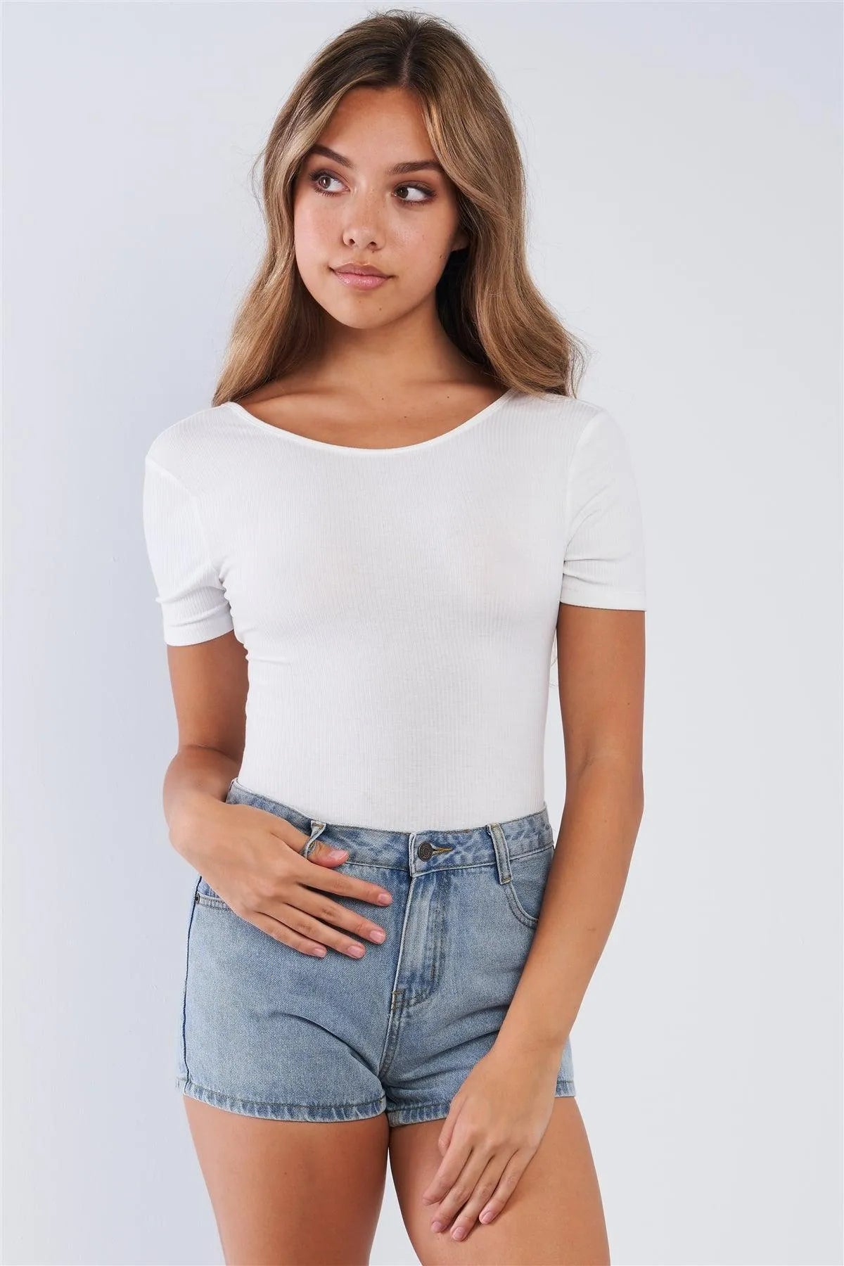 🖤 Bodysuit features: White, backside cutout, solid, ribbed, snap crotch closure, crew neckline, short sleeve, stretchy, comfy casual