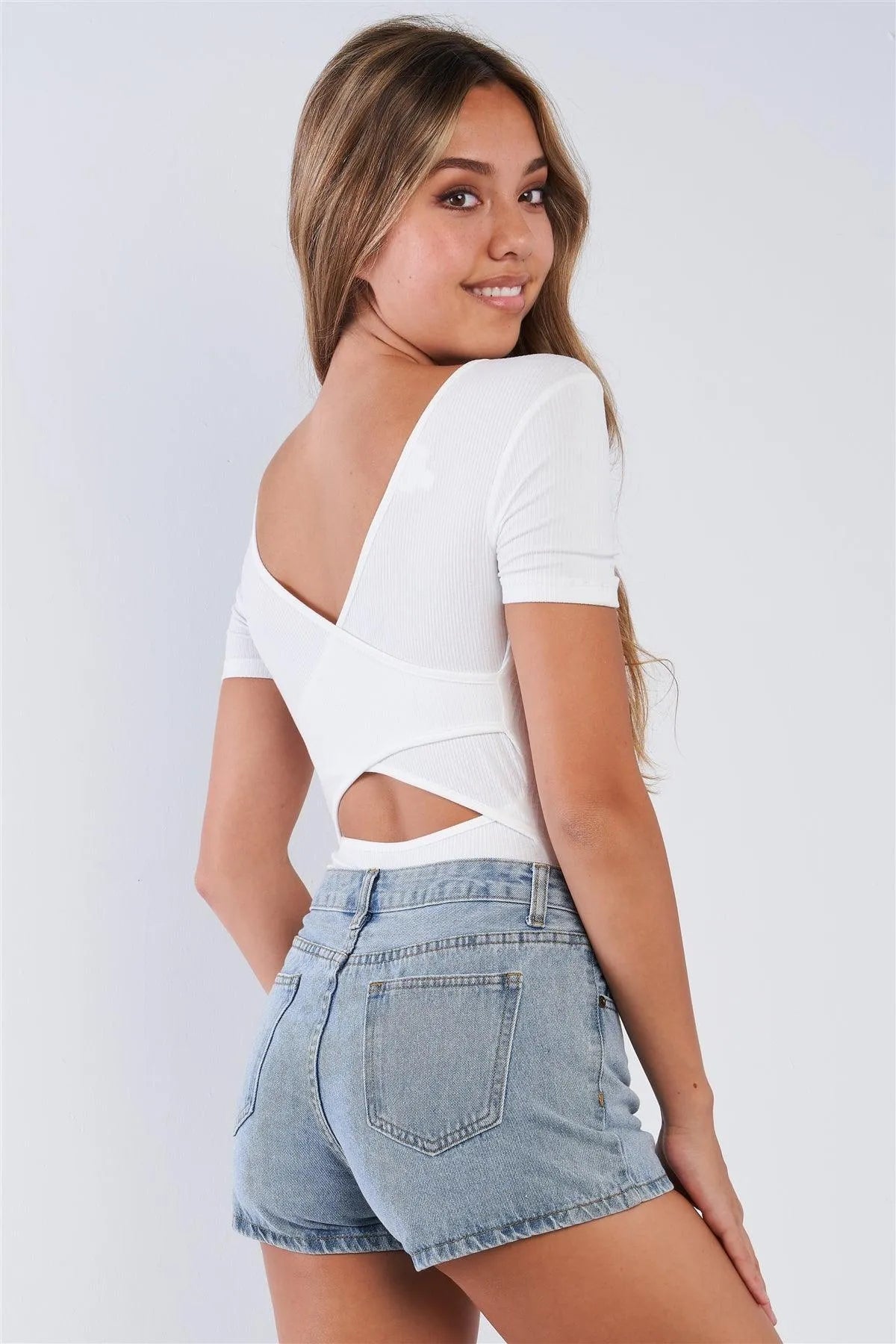 🖤 Bodysuit features: White, backside cutout, solid, ribbed, snap crotch closure, crew neckline, short sleeve, stretchy, comfy casual