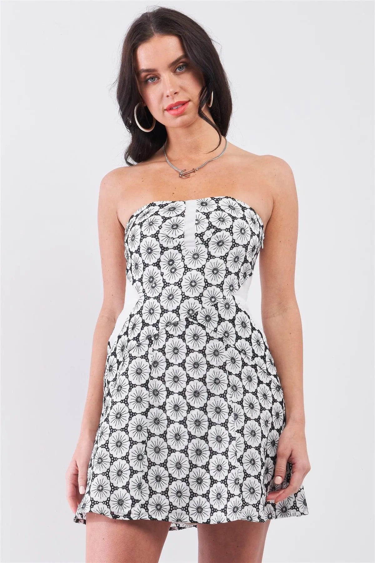 White & Black Floral Crochet Sleeveless Strapless Smock Back Detail Mini Dress /1-2-2-1