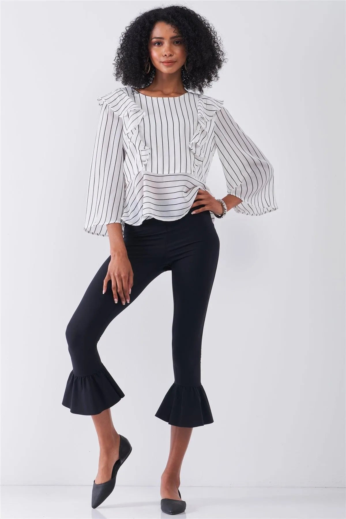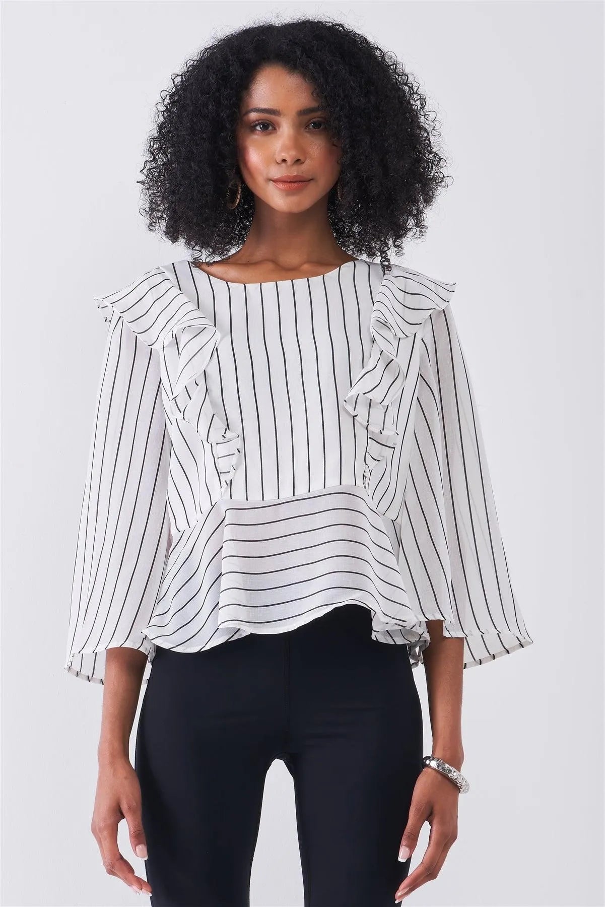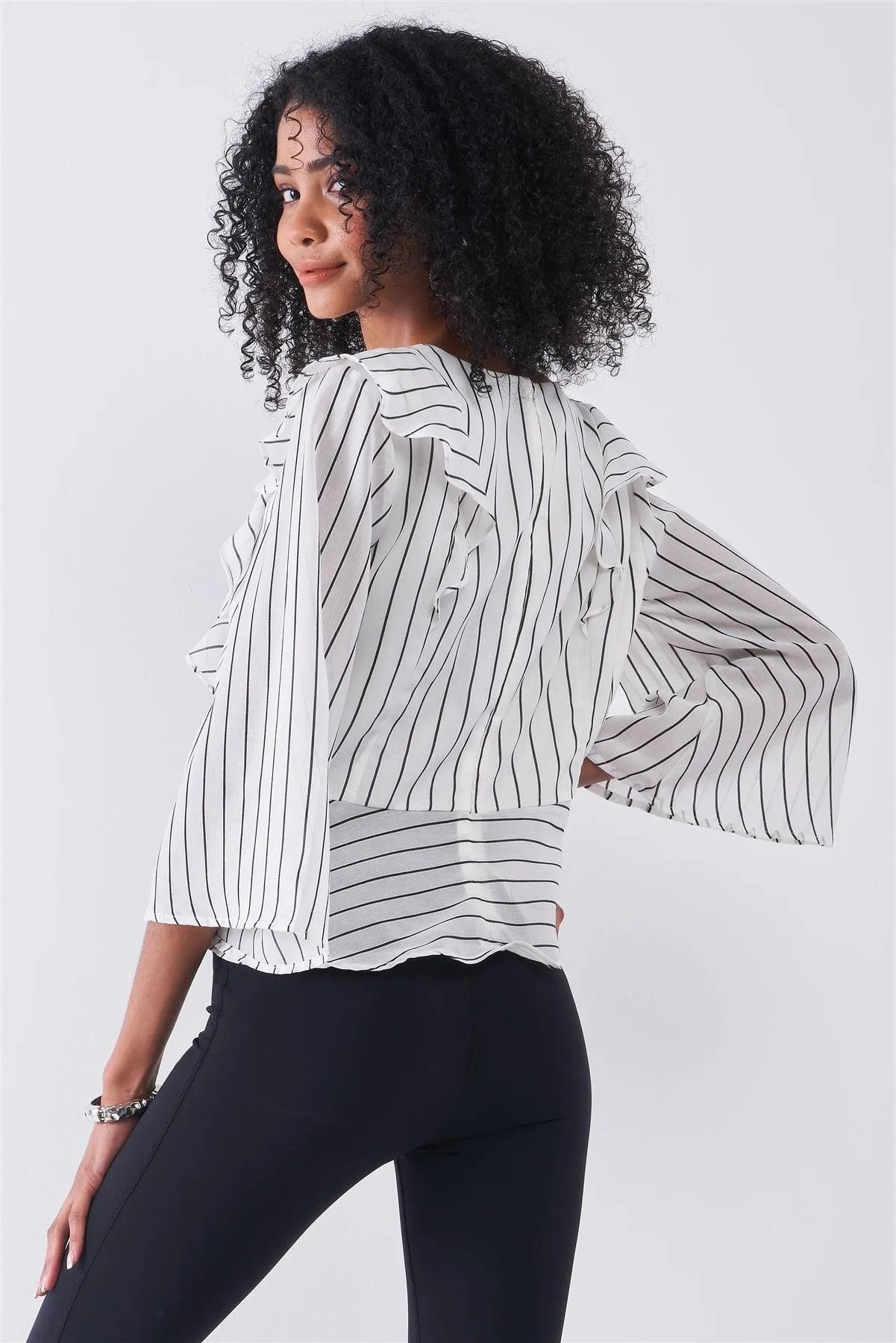 White & Black Pinstriped Ruffle Trim Angel Sleeve Detail Relaxed Blouse /1-2-1