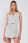 White & Black Pinstriped Sleeveless Wrap Front Self-Tie Waist Romper /1-1-2-2