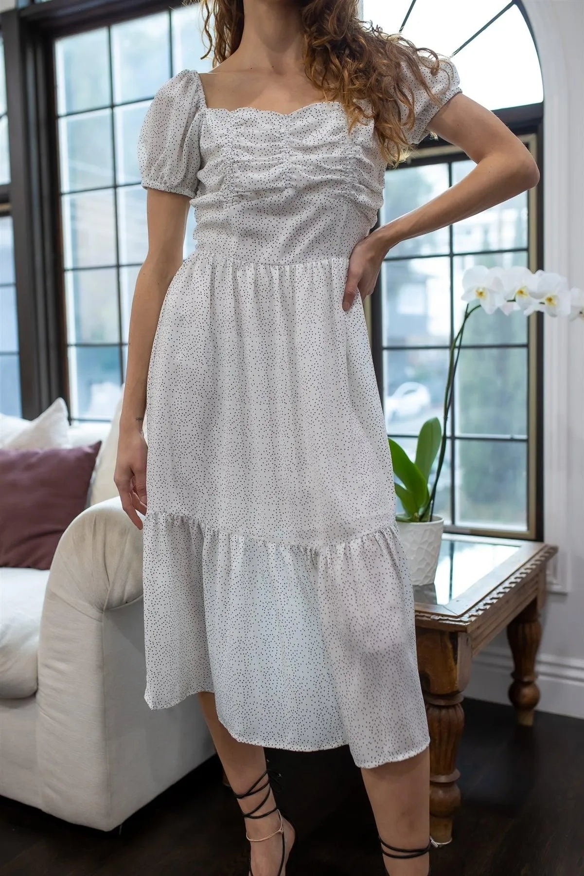 White & Black Polka Dot Ruched Top Puff Short Sleeve Midi Dress /1-2-3-1