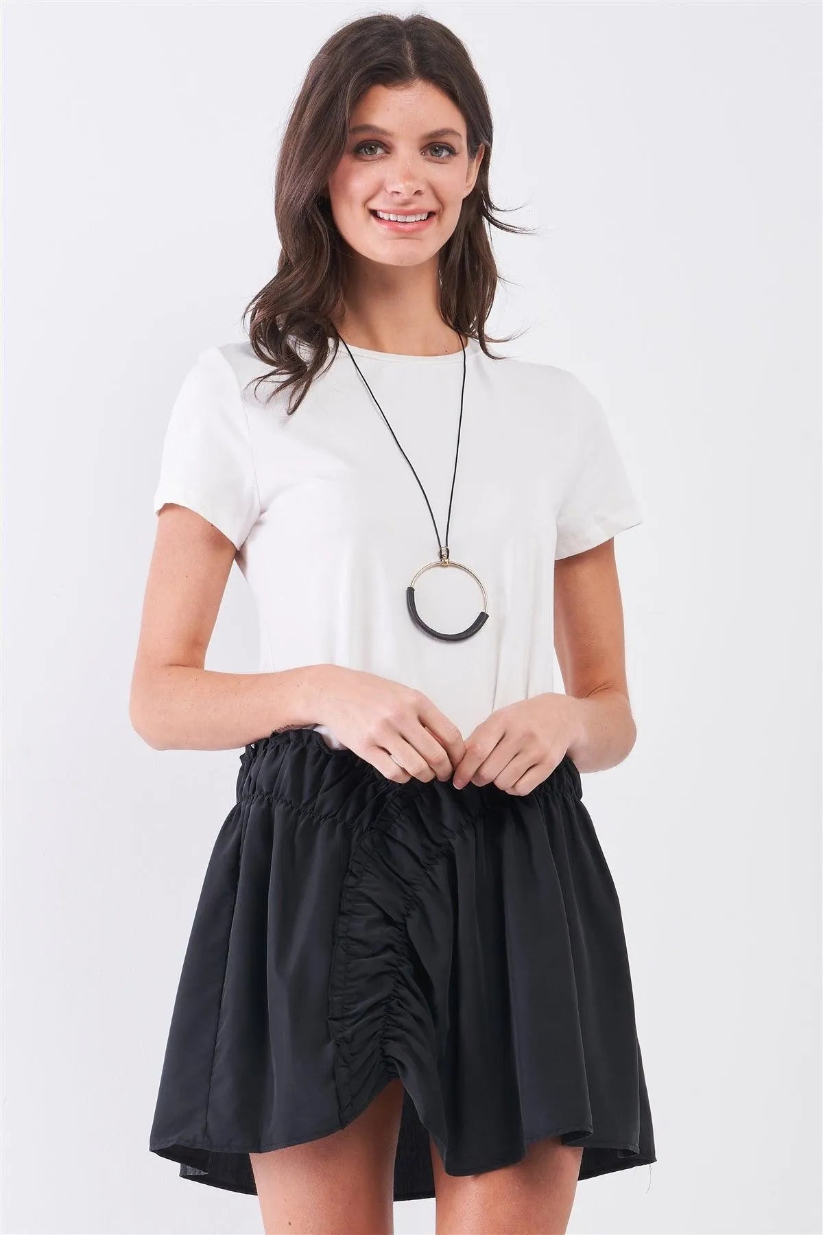 White & Black Short Sleeve Round Neck Dropped Waist Elastic Shirred Detail T-Shirt Mini Dress /1-2-2