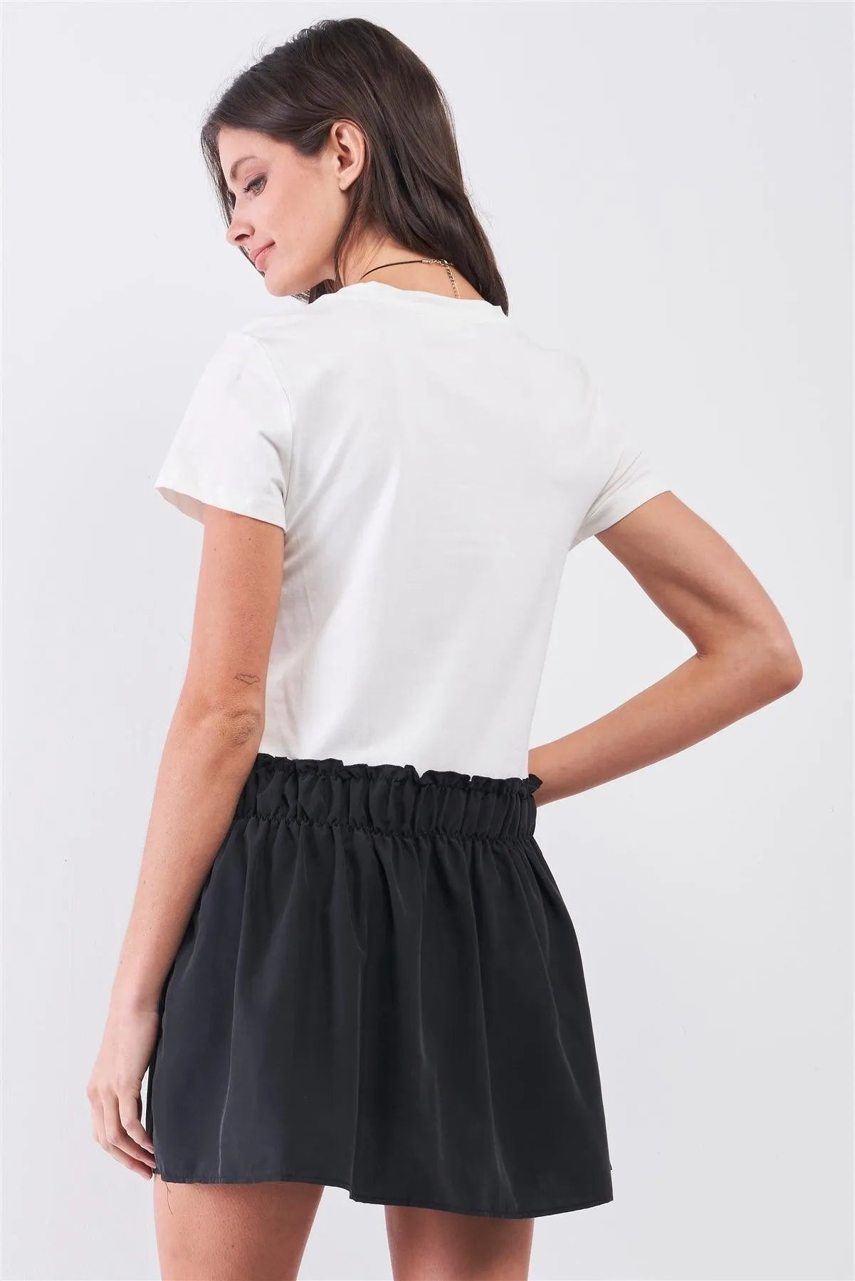 🖤 Item Features: White top & black bottom, solid, short sleeve, round neckline, t-shirt cut, dropped waist, elasticated shirred detail on the bottom, unlined, non-sheer, mini length, stretchy fabric, loose fit, no zipper, casual, summer wear, great with sneakers, stylish, comfy, breathable