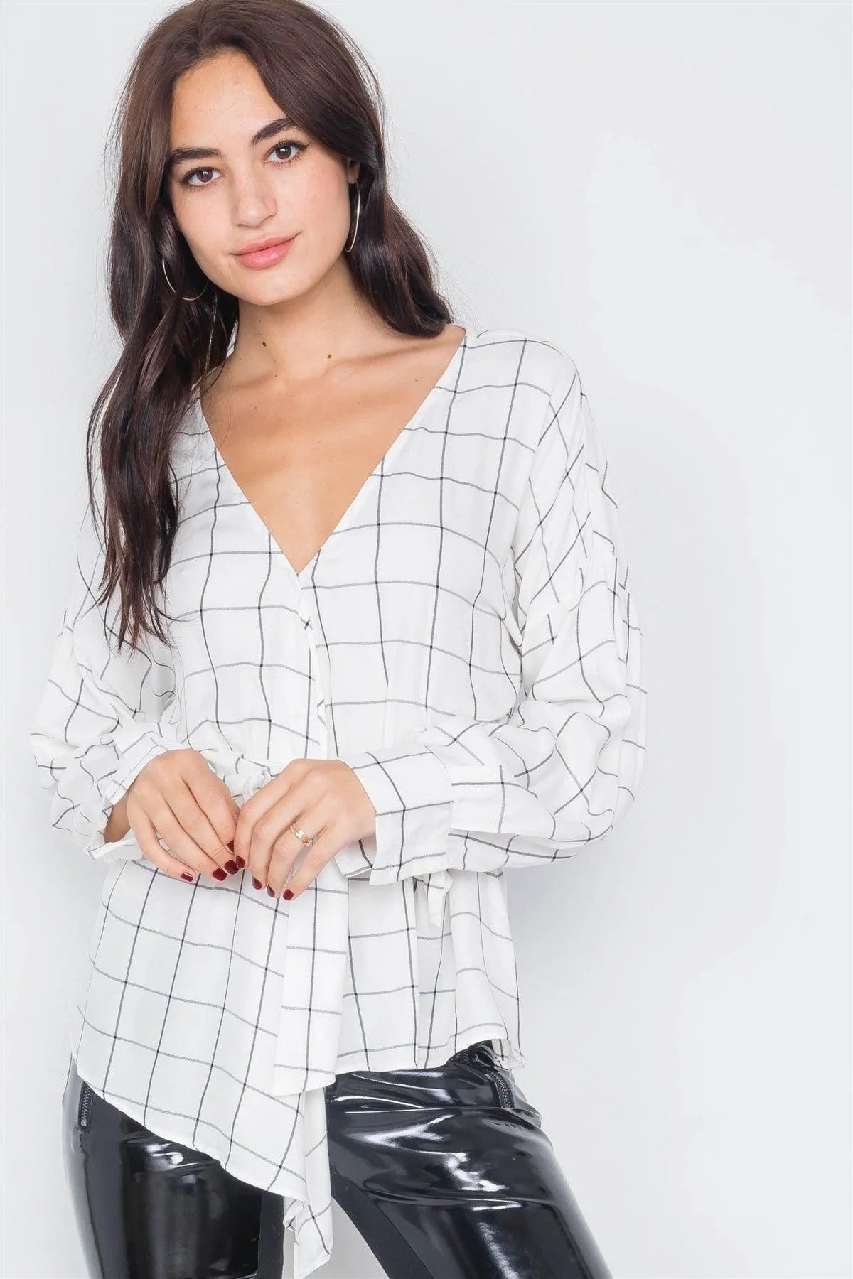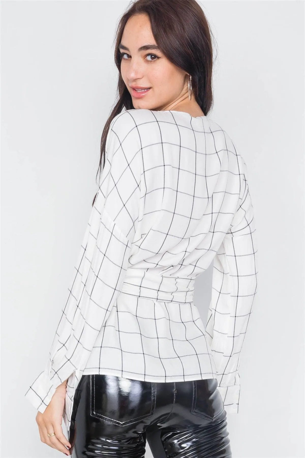 Top features: v-neck, side button closure, waist sash tie, white plaid stripes, full sleeve button cuff wrist, surplus neckline, drop shoulder, unlined, stretchy.Model is 5'9 wearing a size Small (Waist: 24", Bust: 32A, Hips: 34")Item measurements: Length: 23'', Bust: 37", Sleeve: 17"True to size Also available in Black