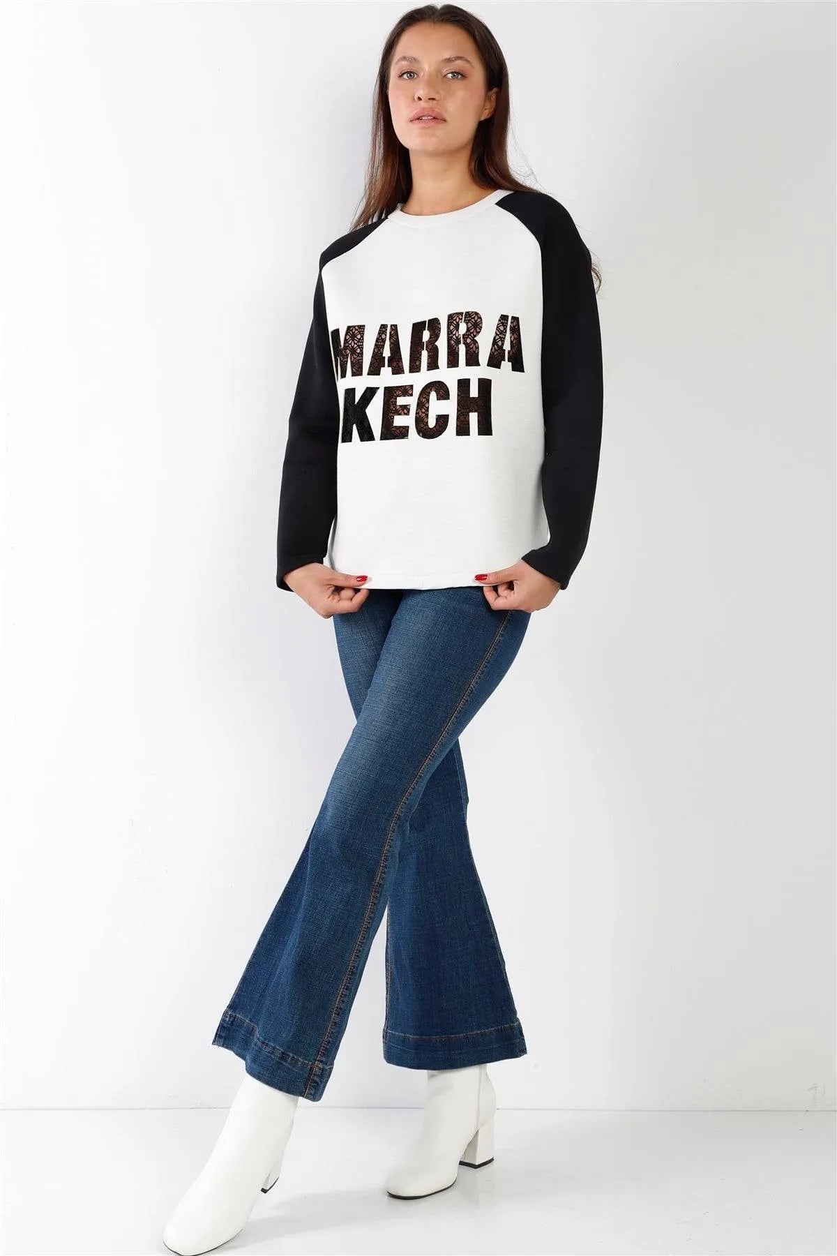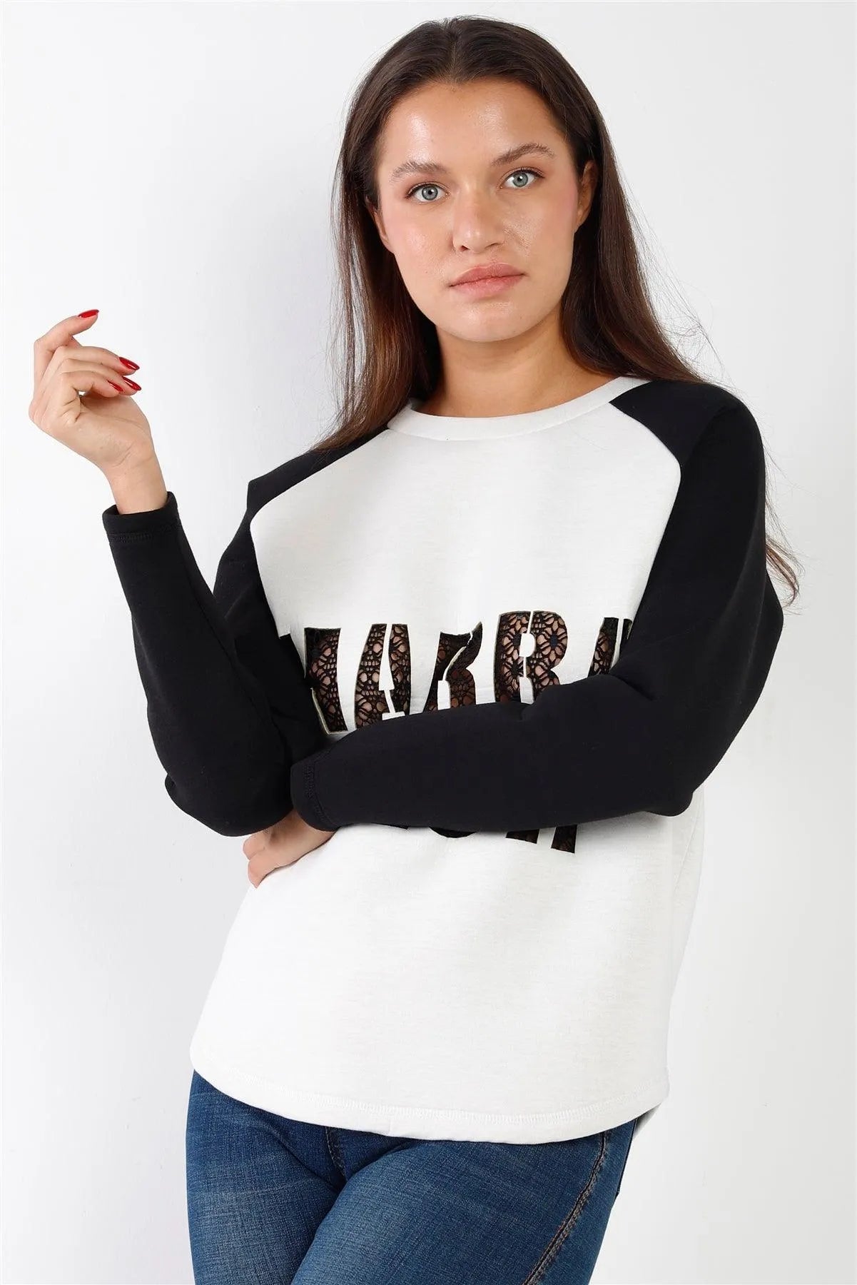 🖤 Item features: White, neoprene texture, sweatshirt style, cut out lace front lettering, long sleeves, dropped shoulder, round neckline, contrast color sleeves, curved hem, relaxed fit, non-stretchy, casual. girlish, lifestyle, streetwear