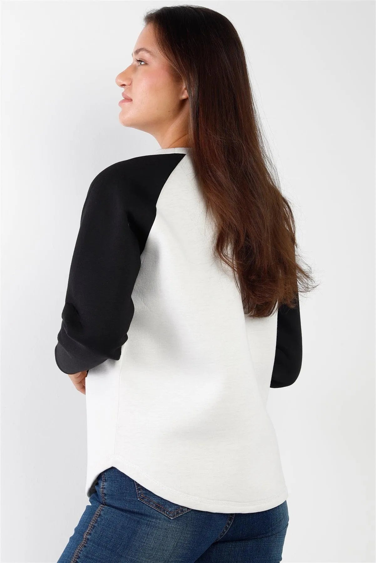 White Contrast Sleeve Curved Hem Sweater / 2-2-2