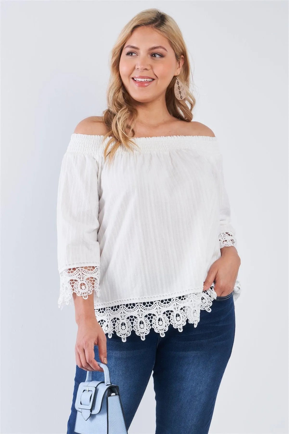 White Cotton Off-The-Shoulder Lace Trim Boho Chic Top /1-2-1-1
