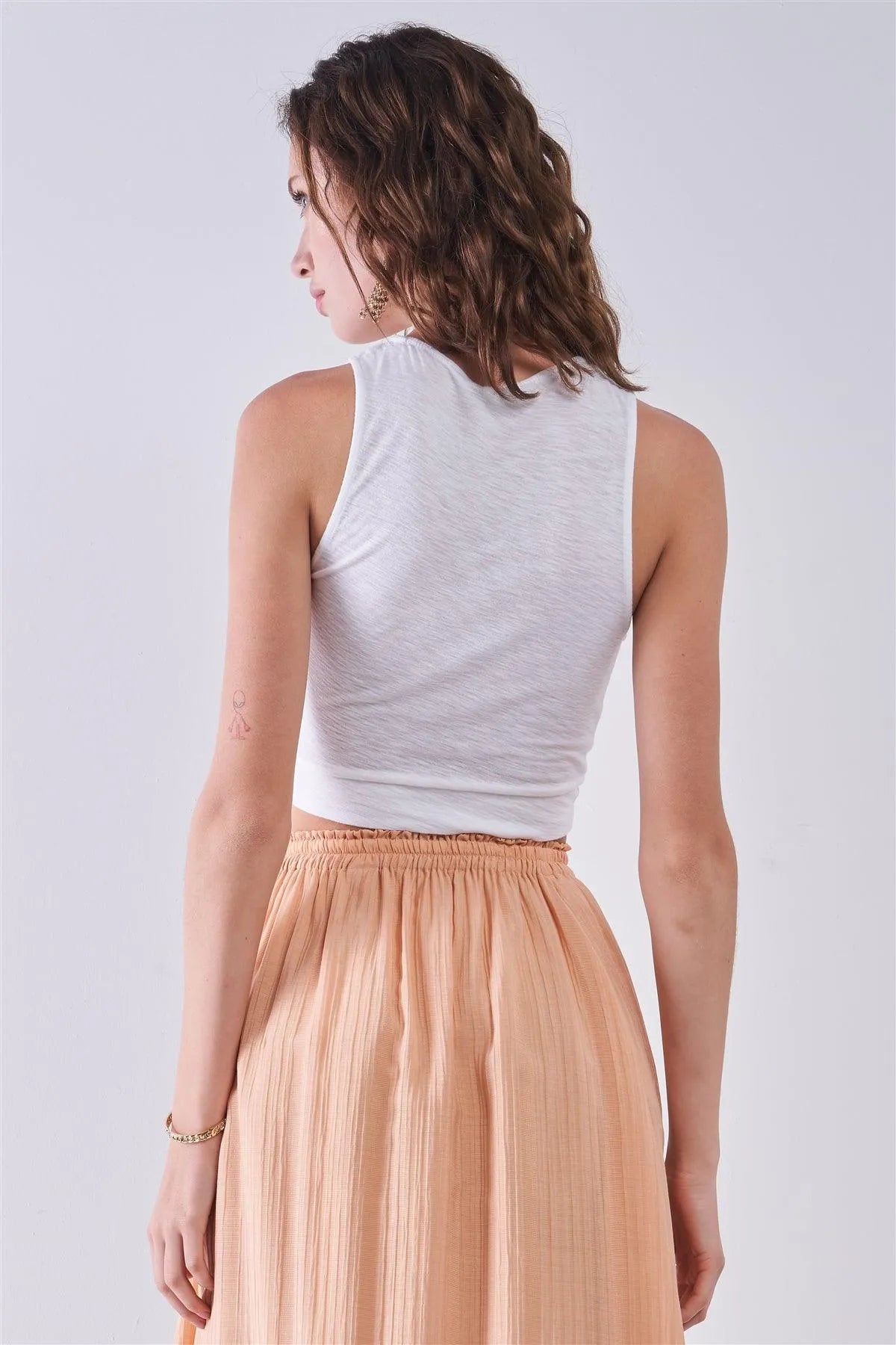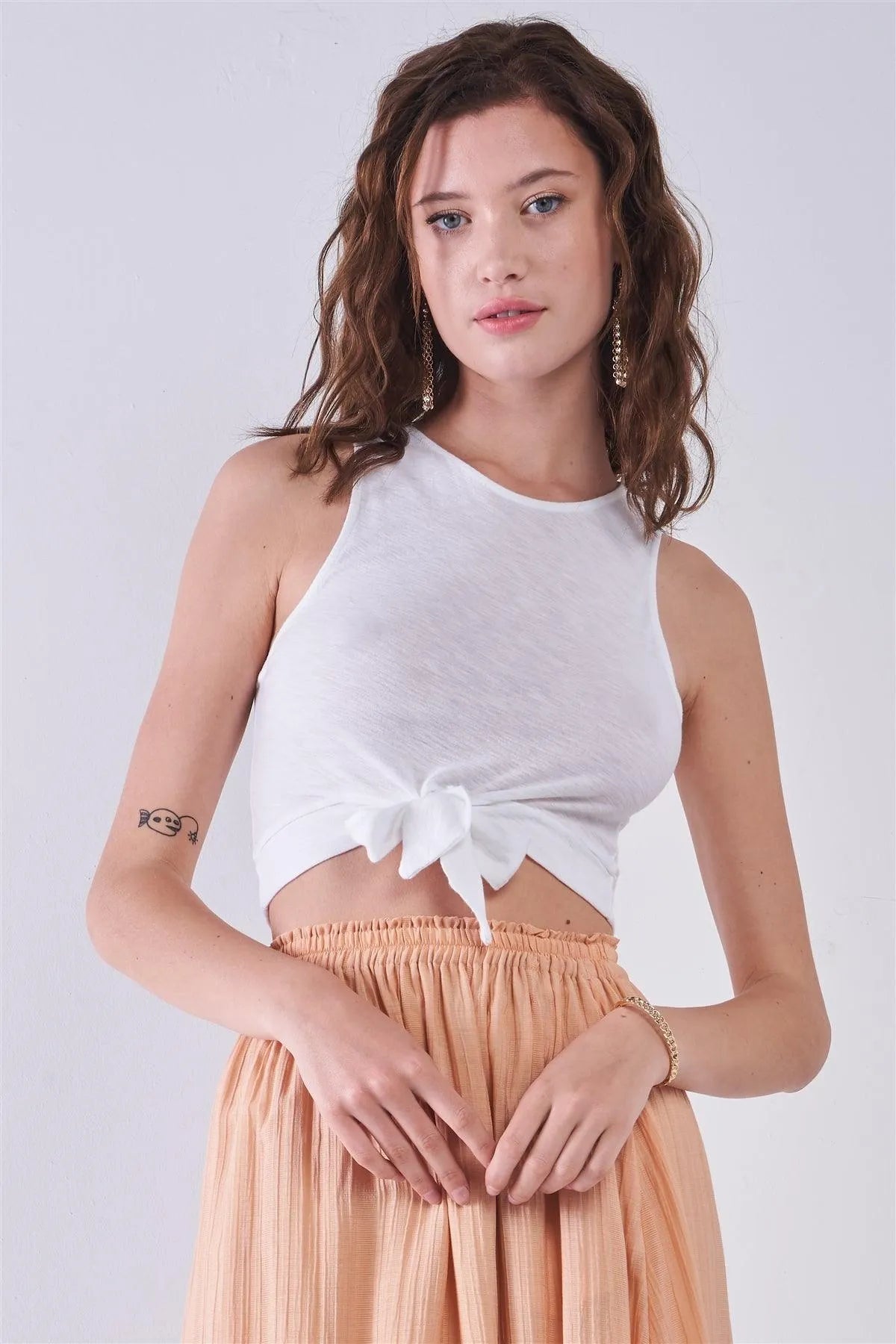 White Sleeveless Crew Neck Self-Tie Front Detail Crop Top /1-2-2-1