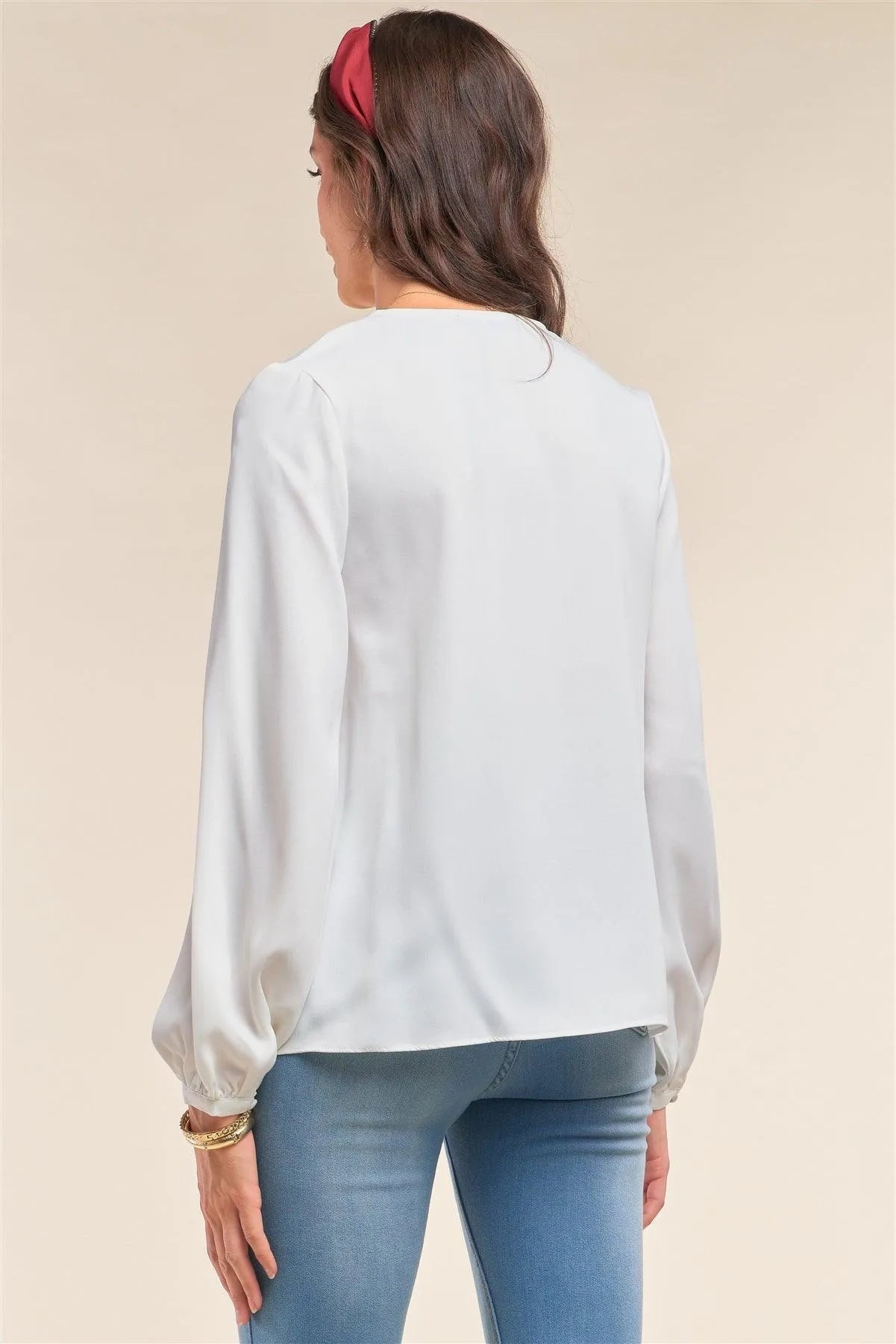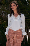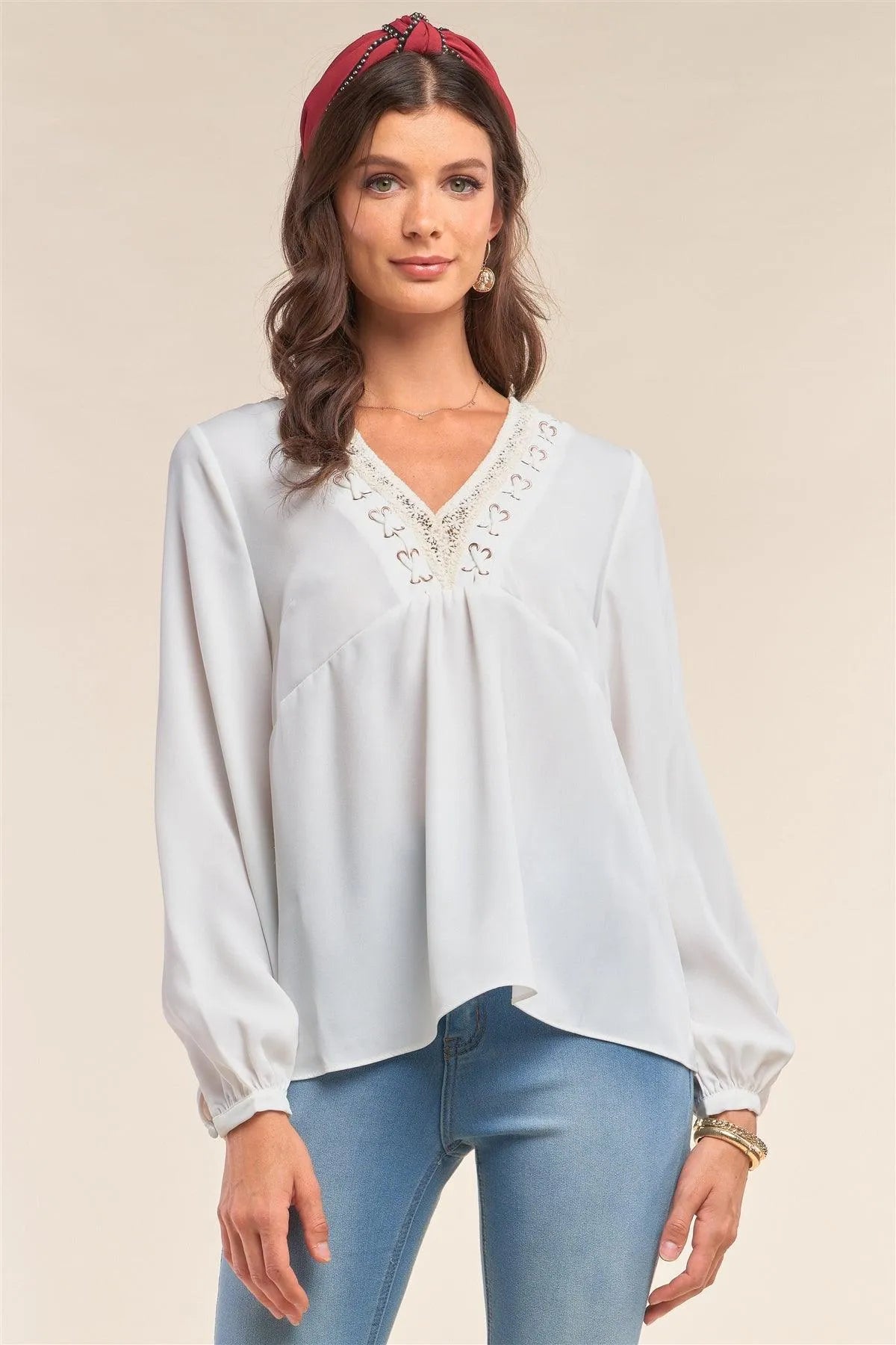 White Long Sleeve Relaxed Fit Criss-Cross Lace Up Crochet V-Neck Detail Blouse