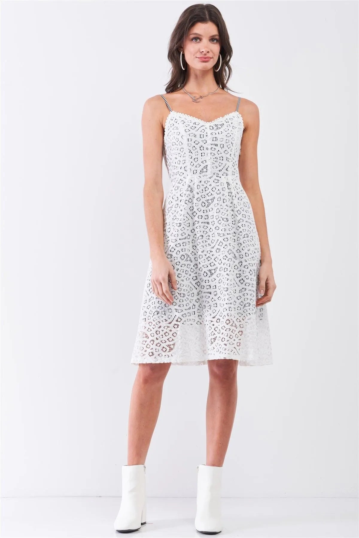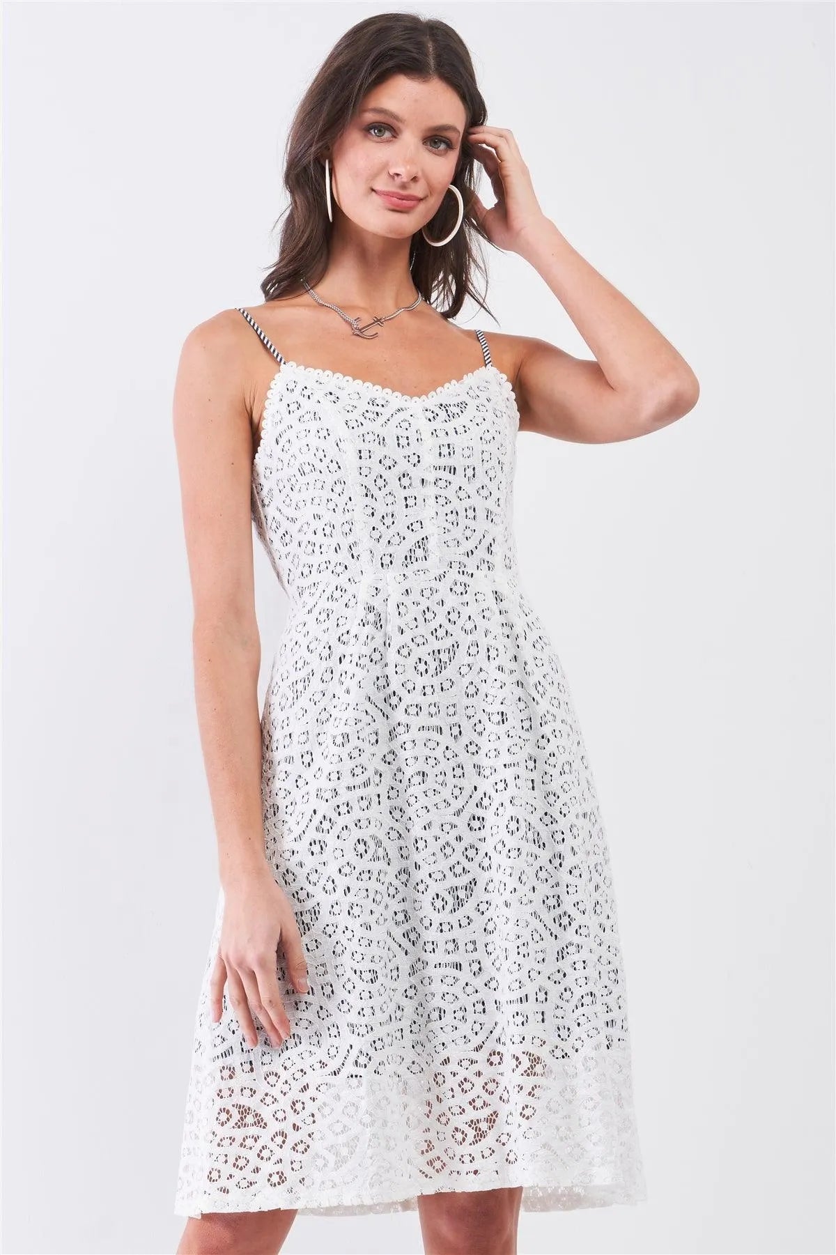 White Crochet Sleeveless Soft V-Neck Double Lined With White & Navy Mini Dress /1-3-2