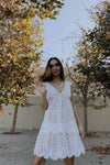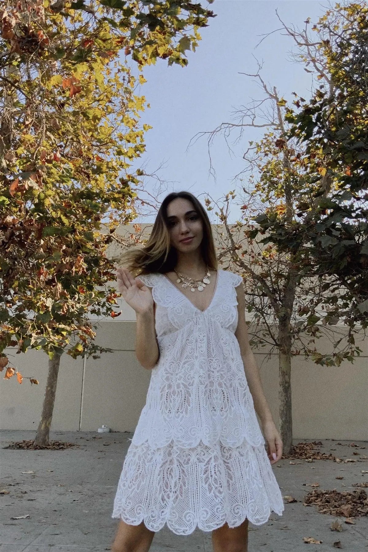 White Deep V-Neck Ruffle Crochet Lace Tiered Mini Dress