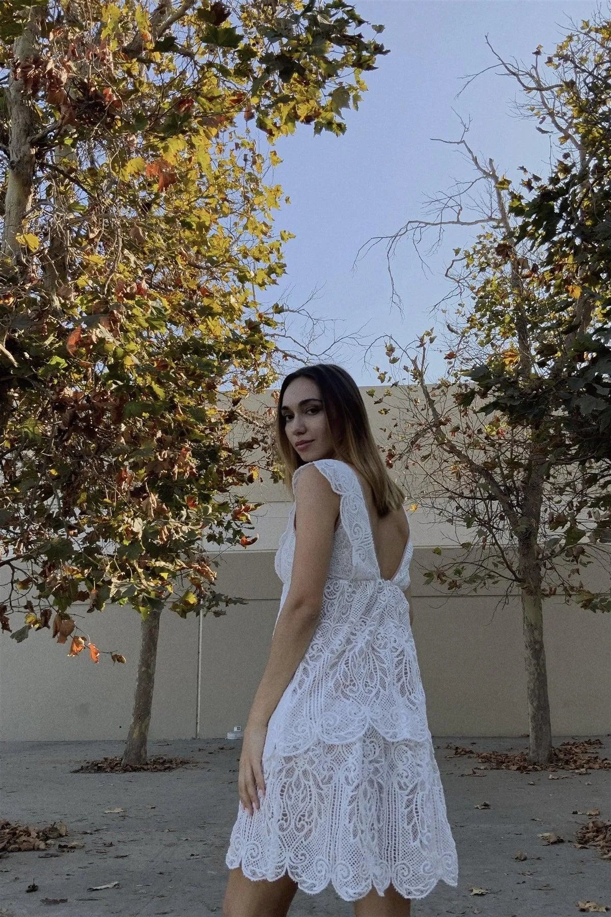 🖤 Item Features: White, solid, lace crochet, deep v-neck, tiered ruffle, open back, mini length, unlined, non-sheer, non-stretch, relaxed fit, lightweight, casual, elevated casual, date night, spring/summer season