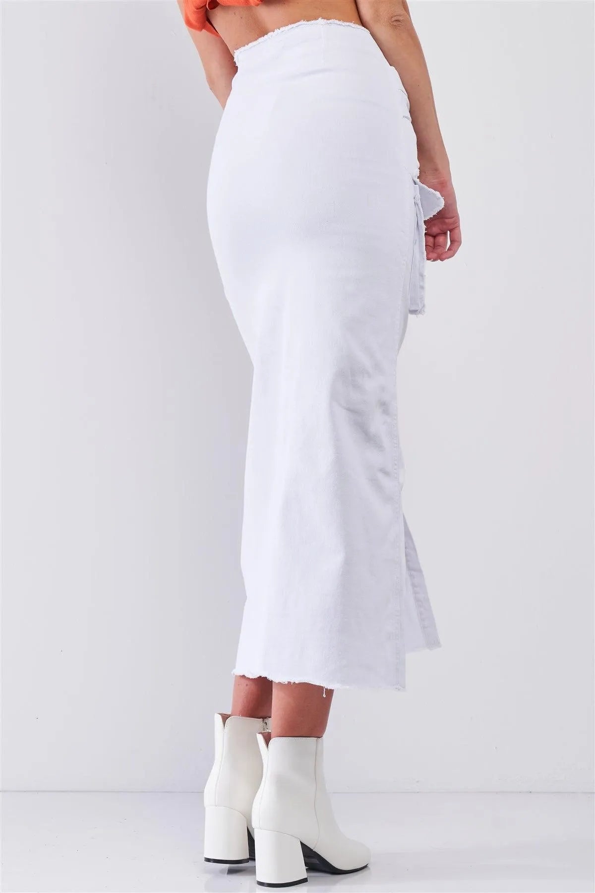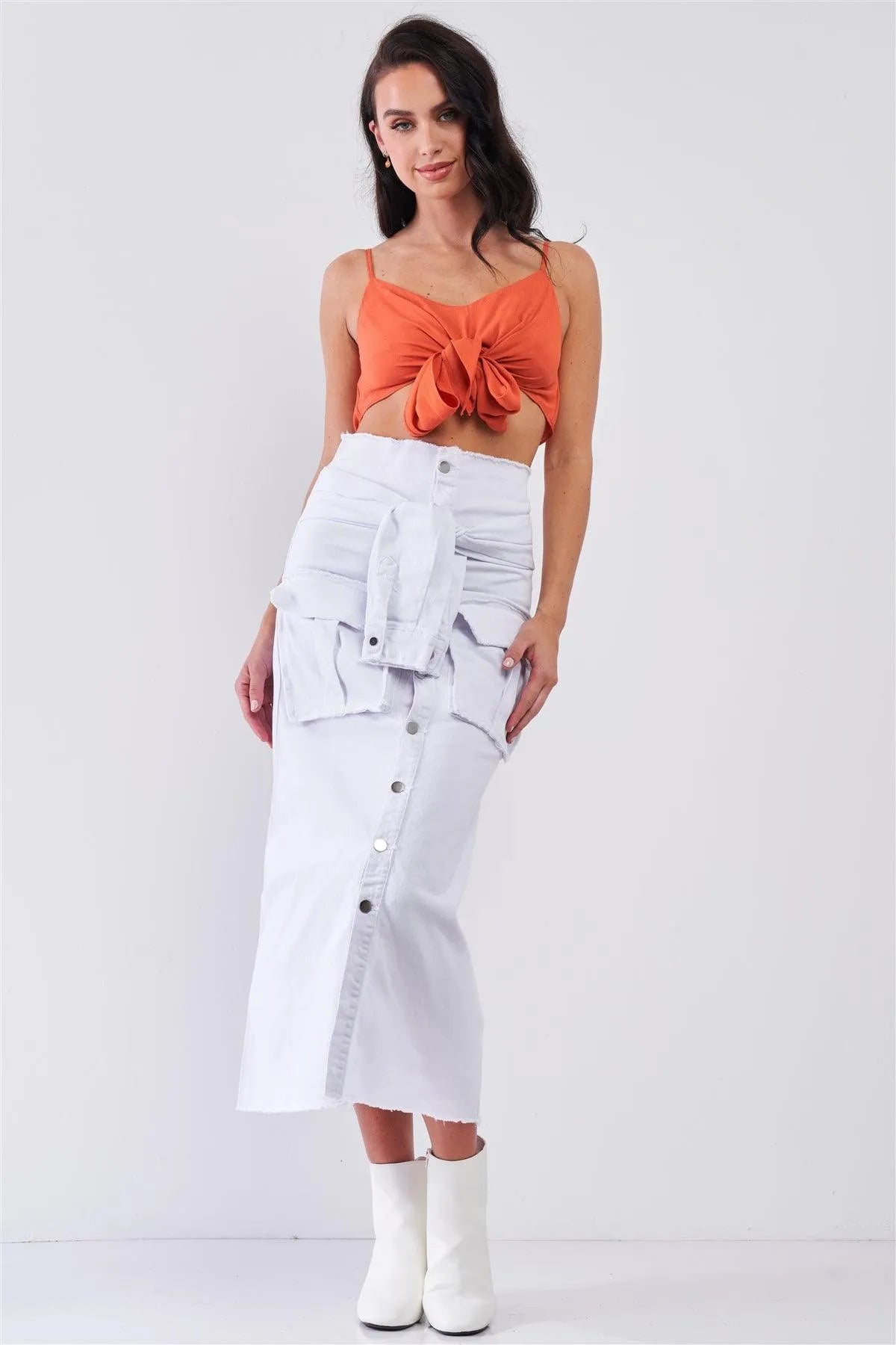 White Denim High Waist Button Down Mock Sleeve Wrap Detail Tube Midi Skirt With Front Pockets /2-2-2