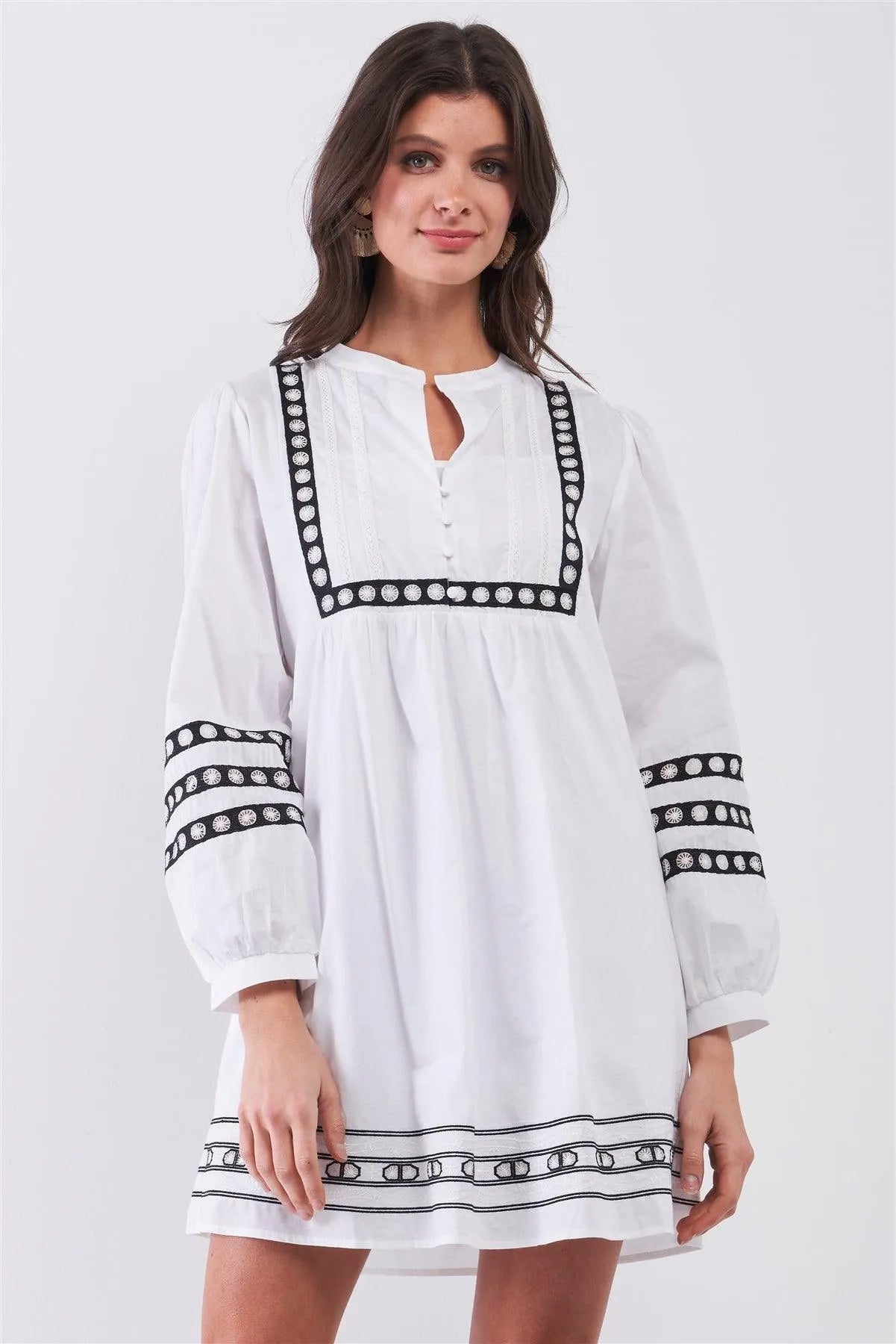 🖤 Item Features: White, black embroidery detail, round neck with button down, balloon sleeve, babydoll cut, mini length, non-stretch, relaxed fit, casual, cute, comfy, breathable, boho inspired, spring/summer collection