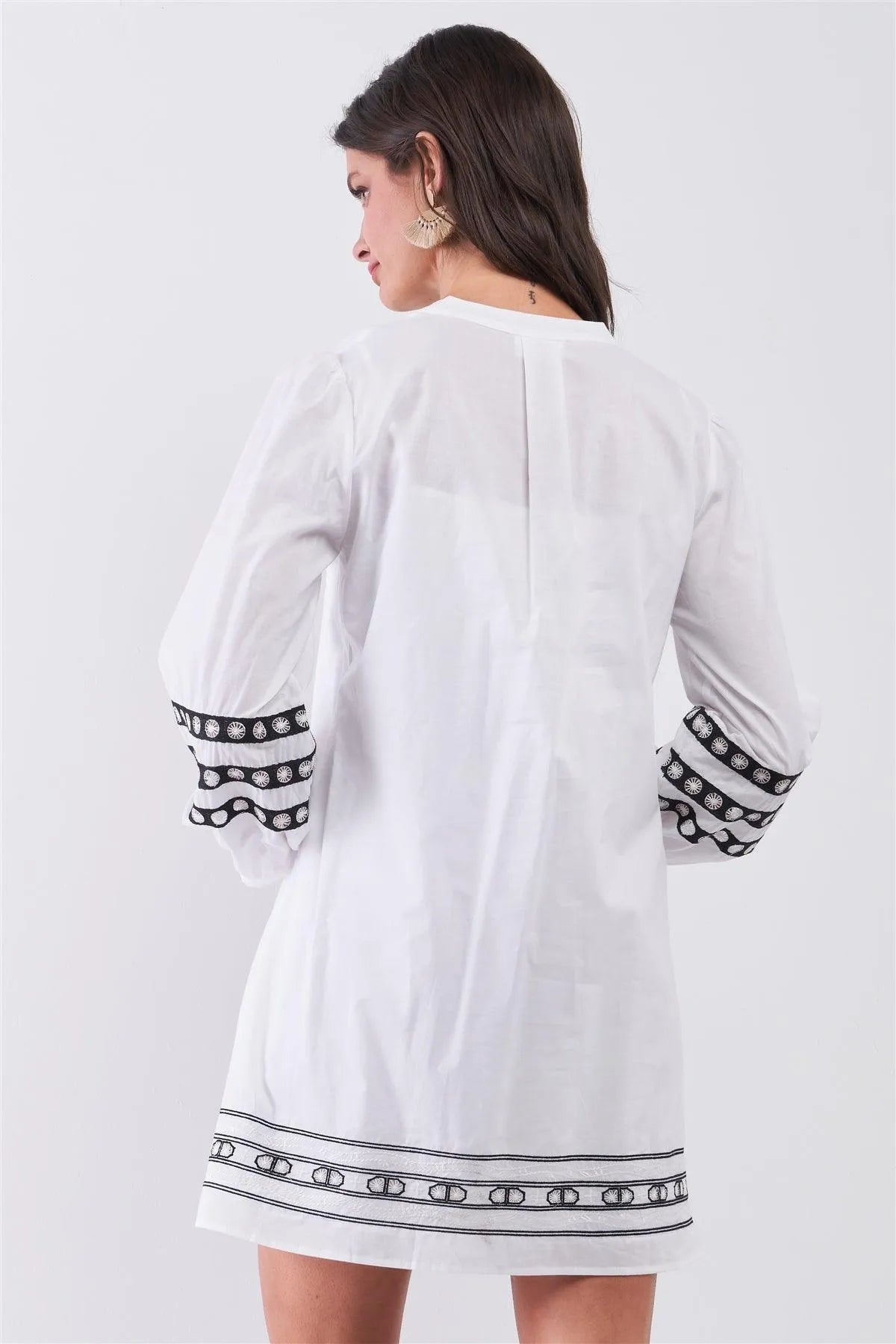 White & Black Embroidered Balloon Sleeve Shift Mini Dress With Slip
