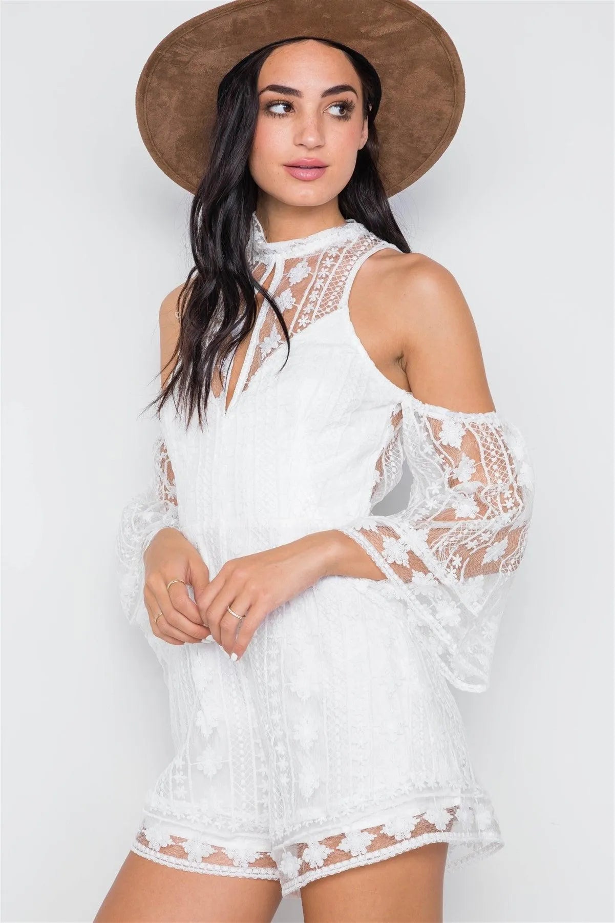 White Floral Embroidery Cold Shoulder Romper /2-2-2-1