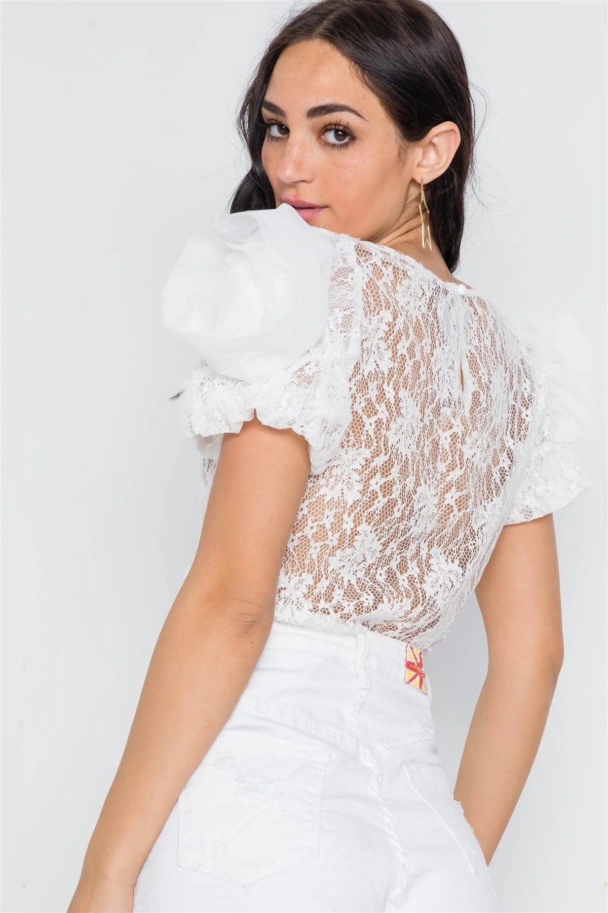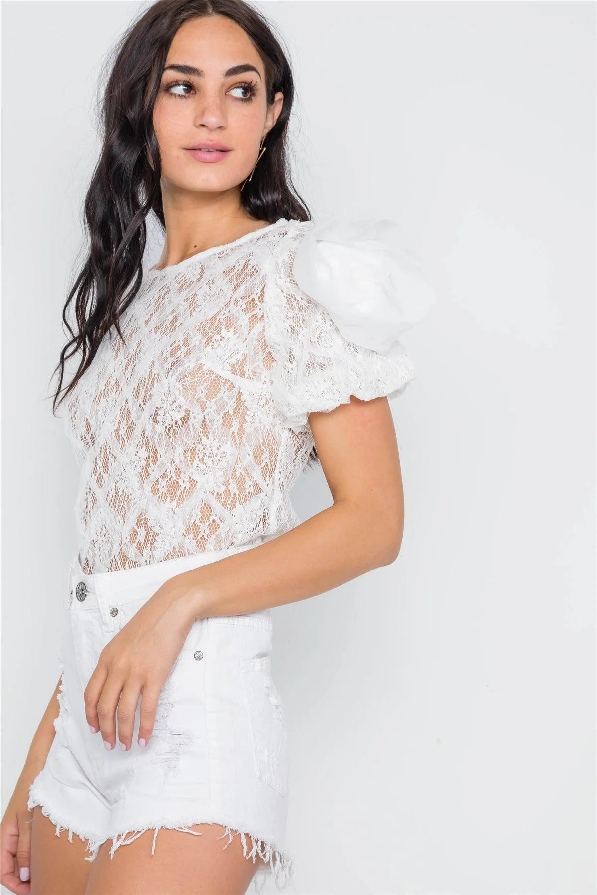 🖤 Item Features: short puff sleeves with mash detailing, fully sheer, round neck, back key hole with button closure, no stretch.