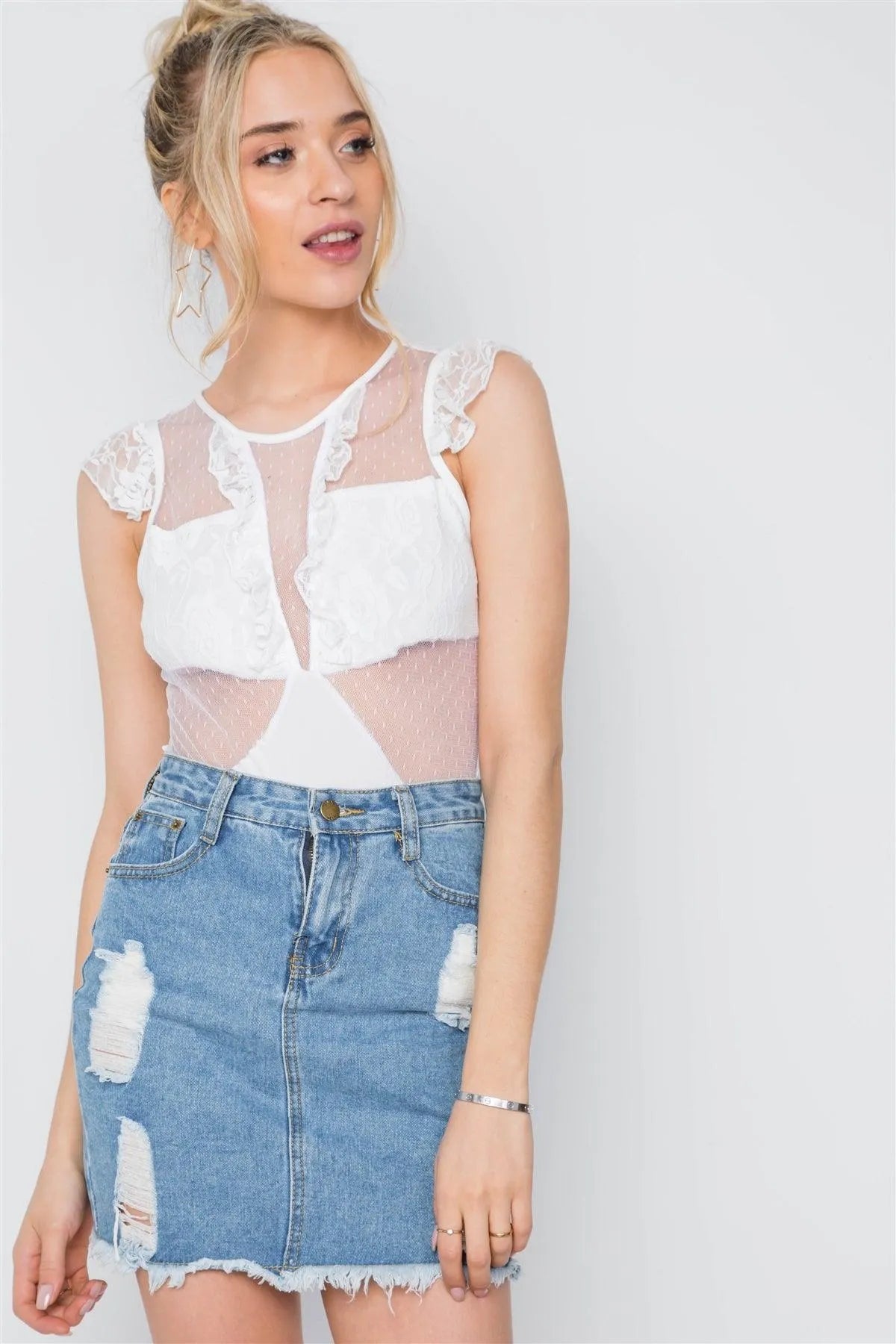 Mock Neck Padded Shoulder With Lace Trim BodysuitVendor:Mustard Seed