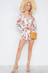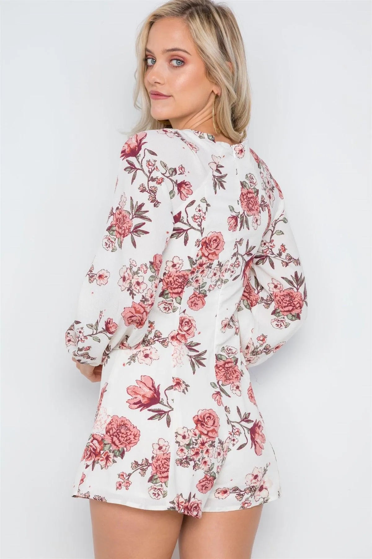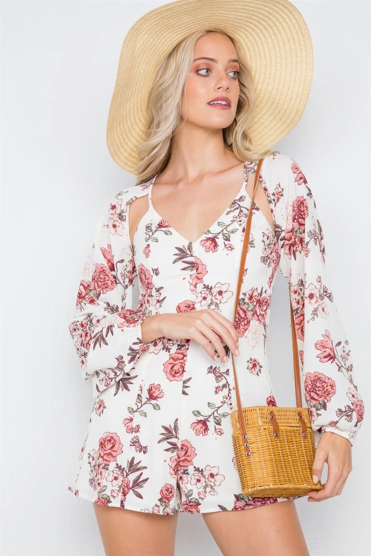 White Floral Print Long Sleeve Cut Out Romper /3-2-1