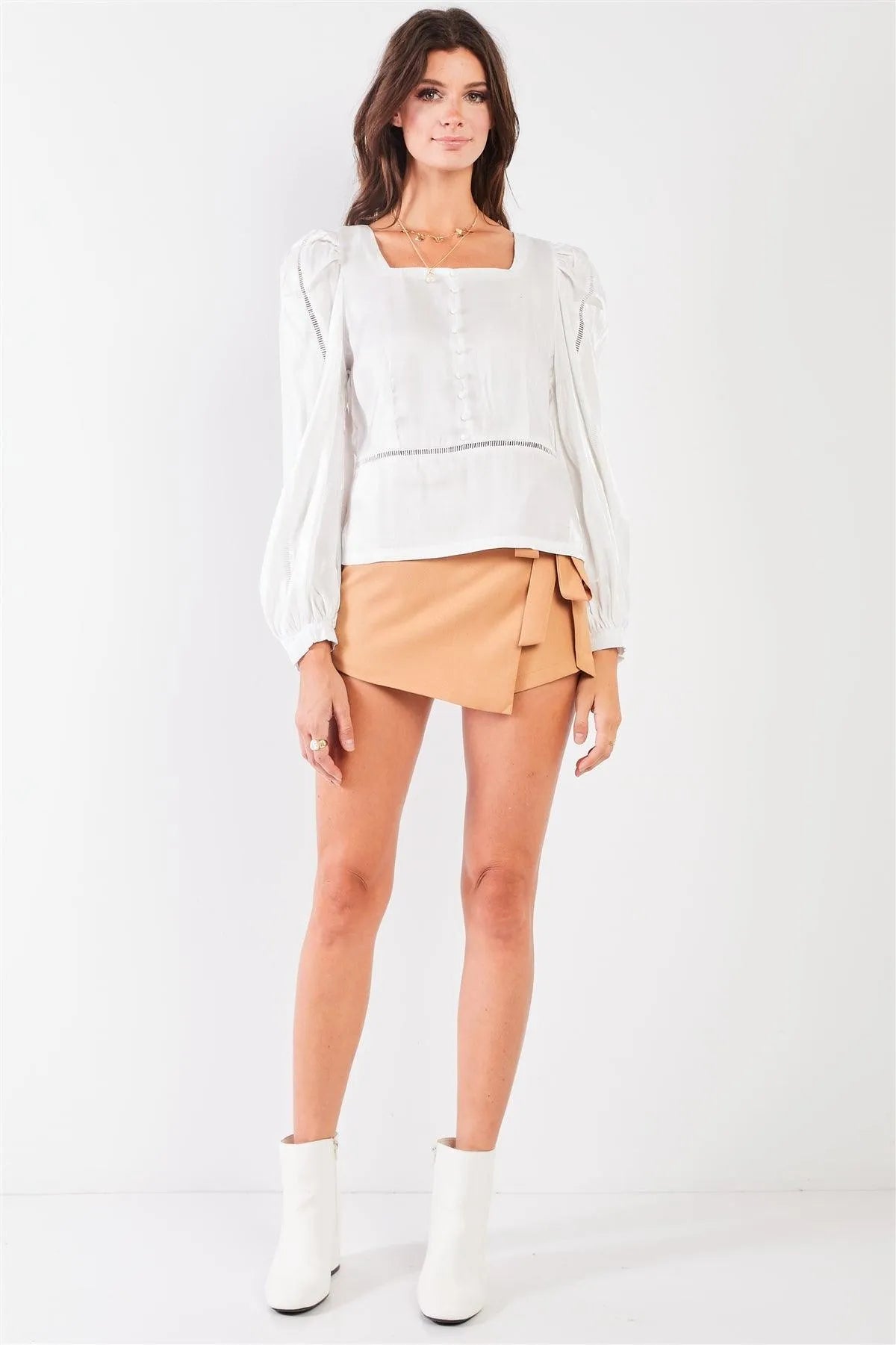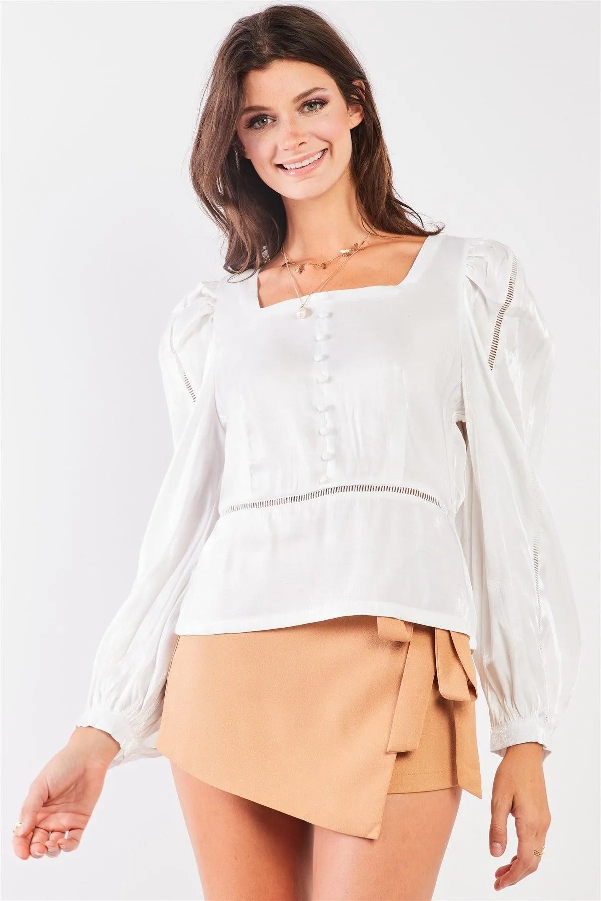 White Glossy Chiffon Square Neck Long Bishop Sleeve Mock Button Down Top /2-2-2