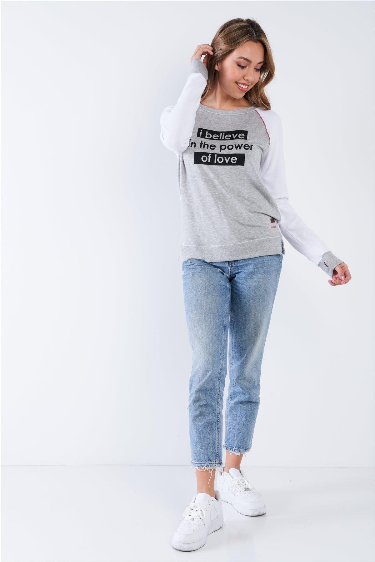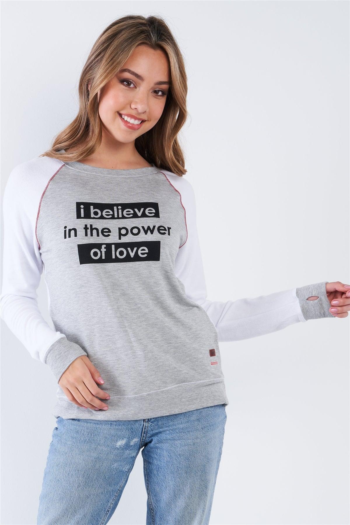 Top Features: White, heather grey, long sleeve, "I Believe In The Power Of Love" front graphic detail, crew neck, thumb hole, unlined, soft material, stretchy, comfy, casual,Model is 5'10" and wearing size Small (Waist: 26", Bust: 33B, Hips: 35")Item Measurements: Length: 26" Bust 40"Item comes pre-packed with hang tagsTrue to size