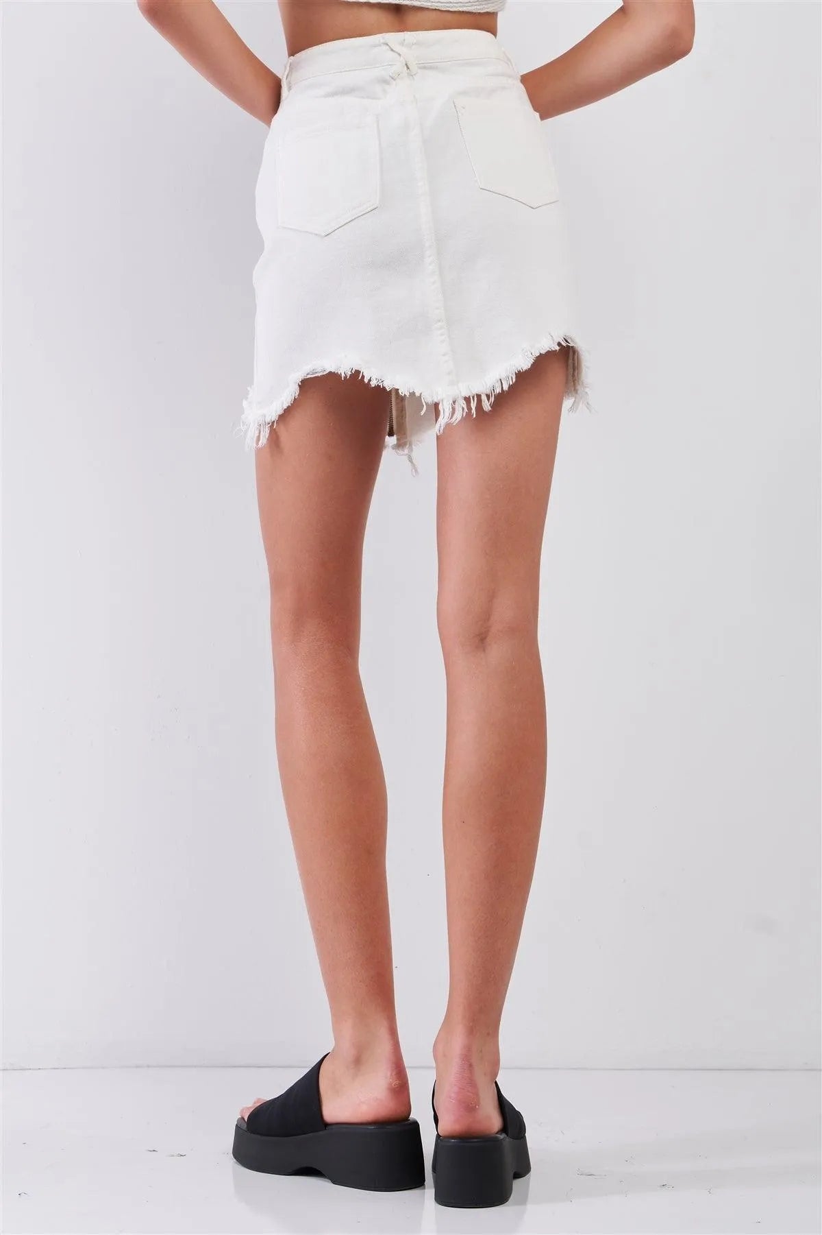 🖤 Upgrade your denim game with our High Waist Shark Bite Hem Front Zip Mini Denim Skirt. Its chic and casual design in solid white is perfect for a boho look. Comes with front and back pockets, belt loop, and frayed wave hem. Zip it up (in more ways than one) and rock this mini for a fun and stylish look. No stretch, unlined.