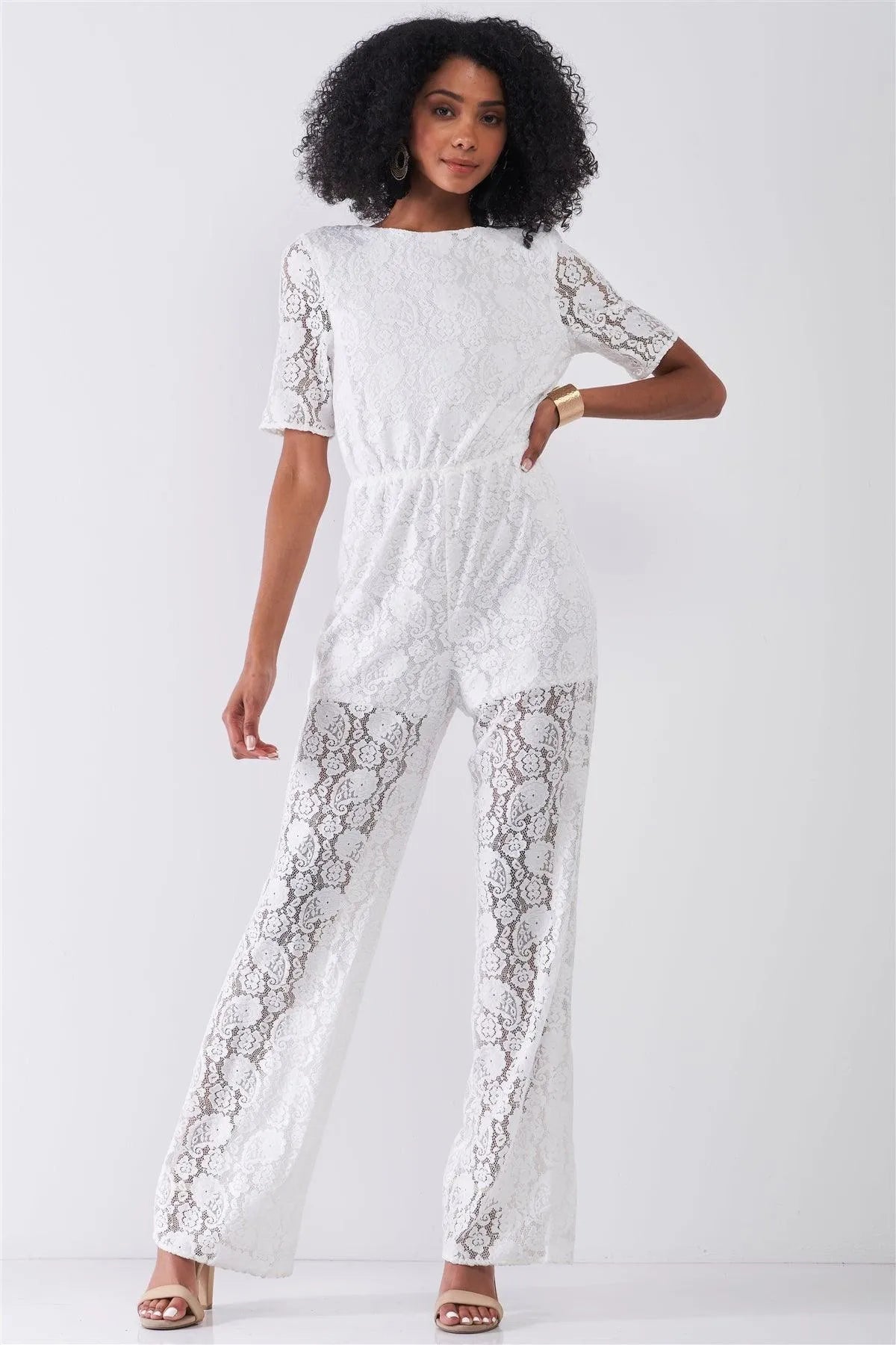 Delicate White Sheer Lace Crochet Semi-Sheer Self-Tie Neck Open Back Detail Wide Leg Jumpsuit /1-2-2-1