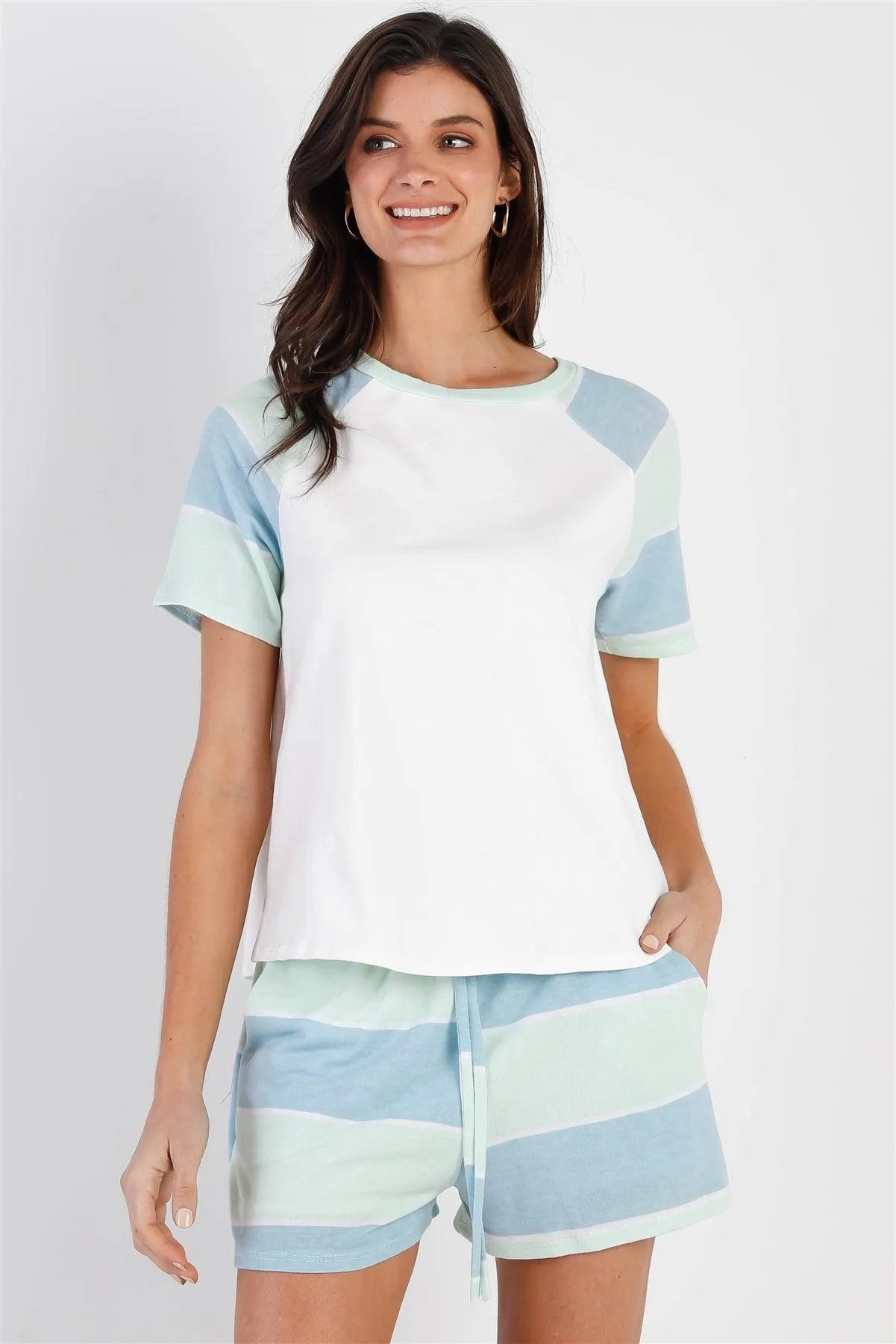 White & Mint Blue Stripe T-Shirt Top & Short Set /2-1-2